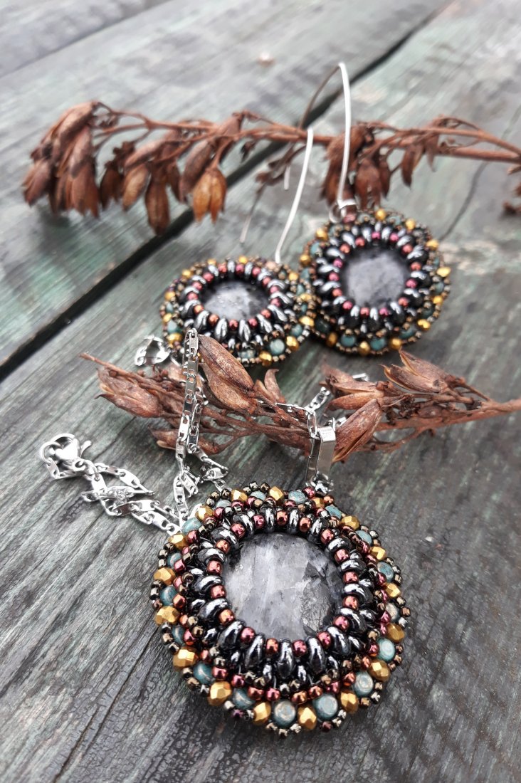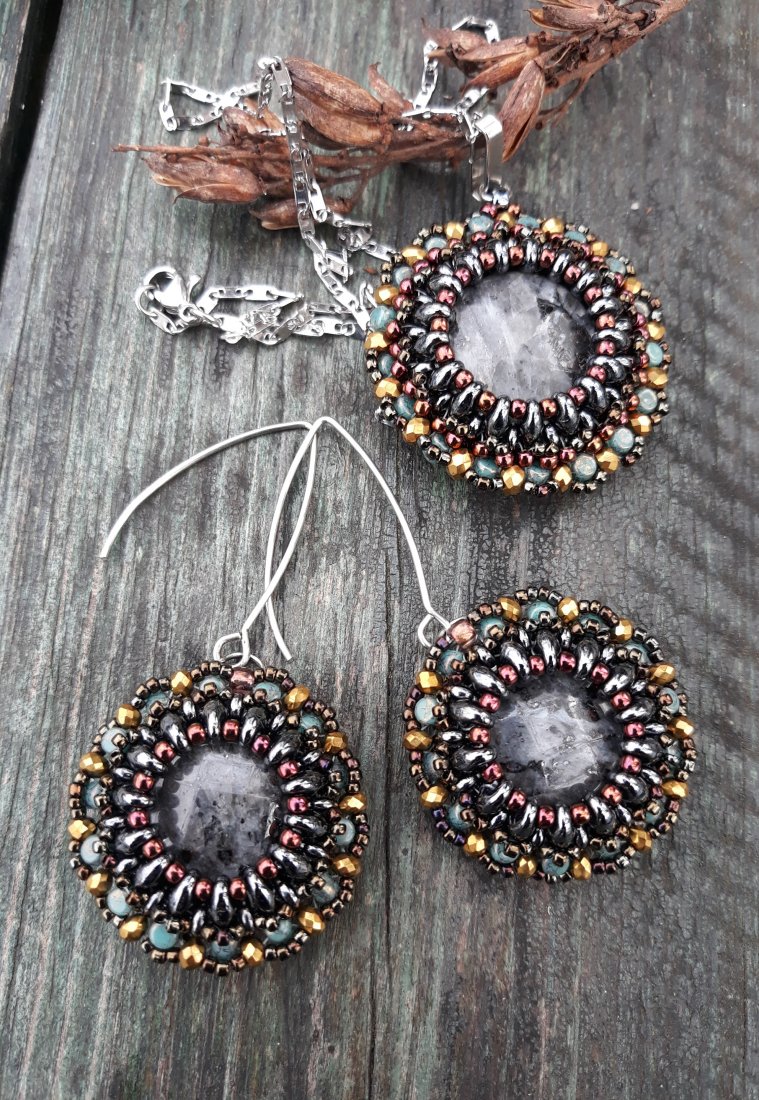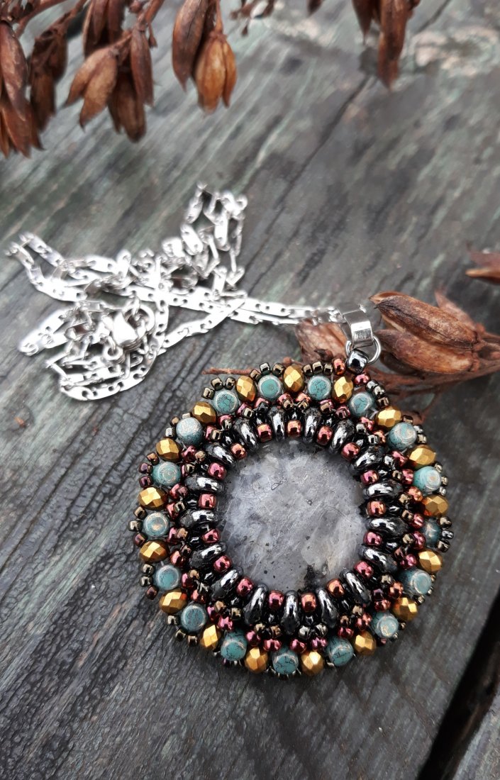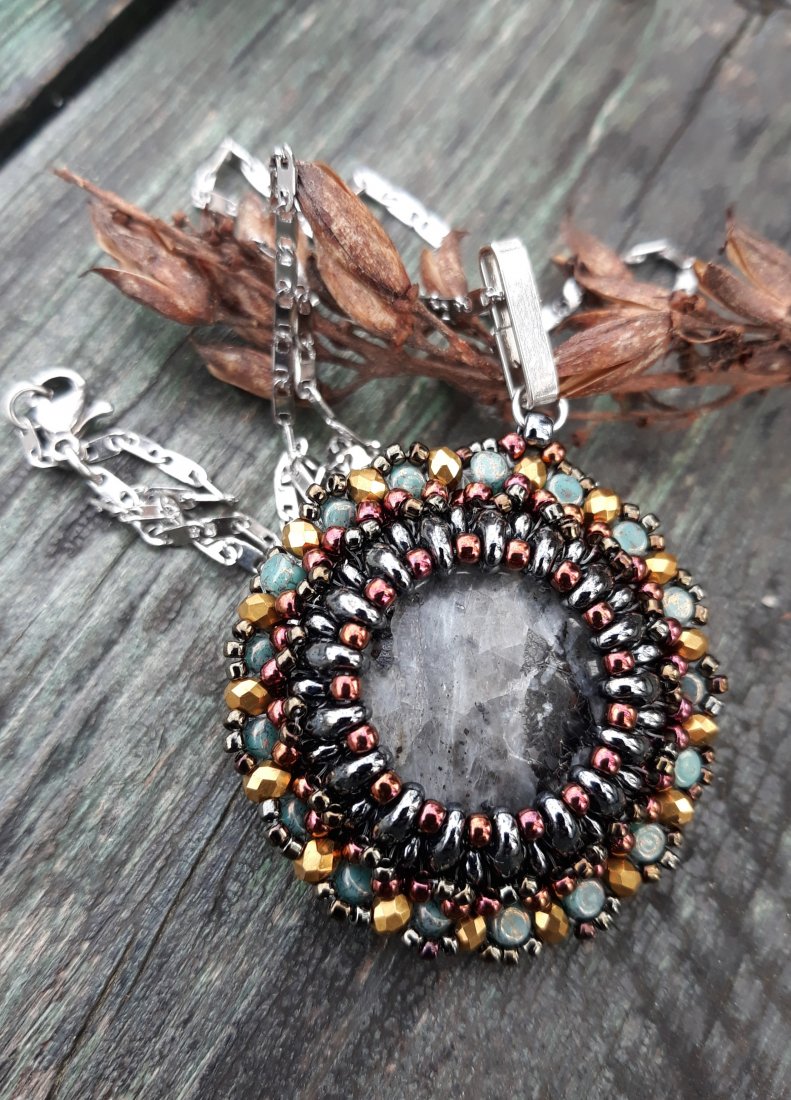 Piękny wisior wykonany z larvikitu i szklanych koralików i kryształków w różnych odcieniach turkusu, czerni i metalicznego brązu. Wisior zawieszony jest na ozdobnym łańcuszku wykonanym ze stali szlachetnej o dł ok 46cm.
