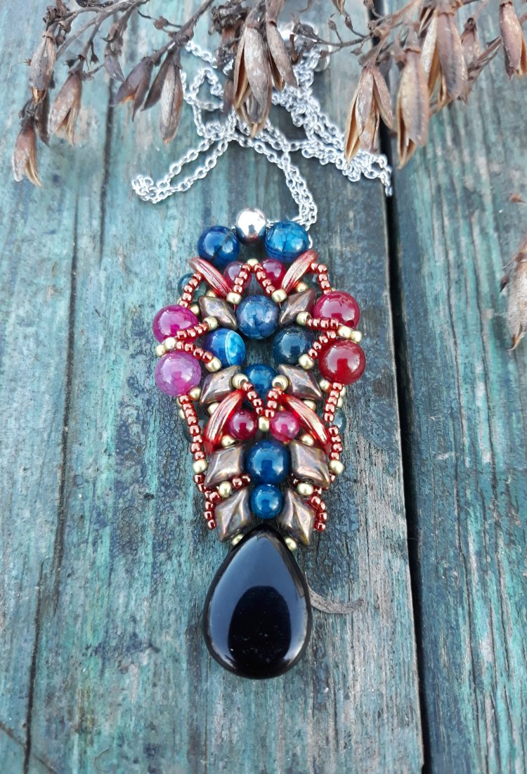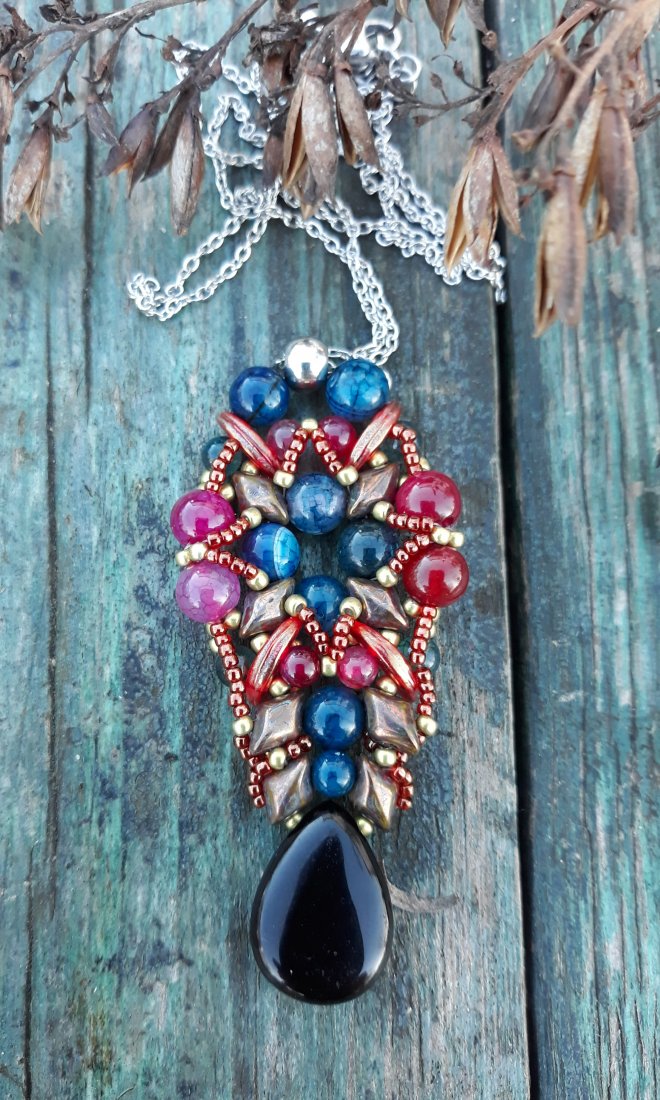 ,,wisior z turmalinem,, to kolorowy wisior wykonany z różowego i niebieskiego turmalinu, czarnego onyksu, złotego hematytu i szklanych koralików i kryształków w różnych odcieniach złota i czerwieni. Wisior zawieszony jest na ozdobnym łańcuszku wykonanym ze stali szlachetnej.