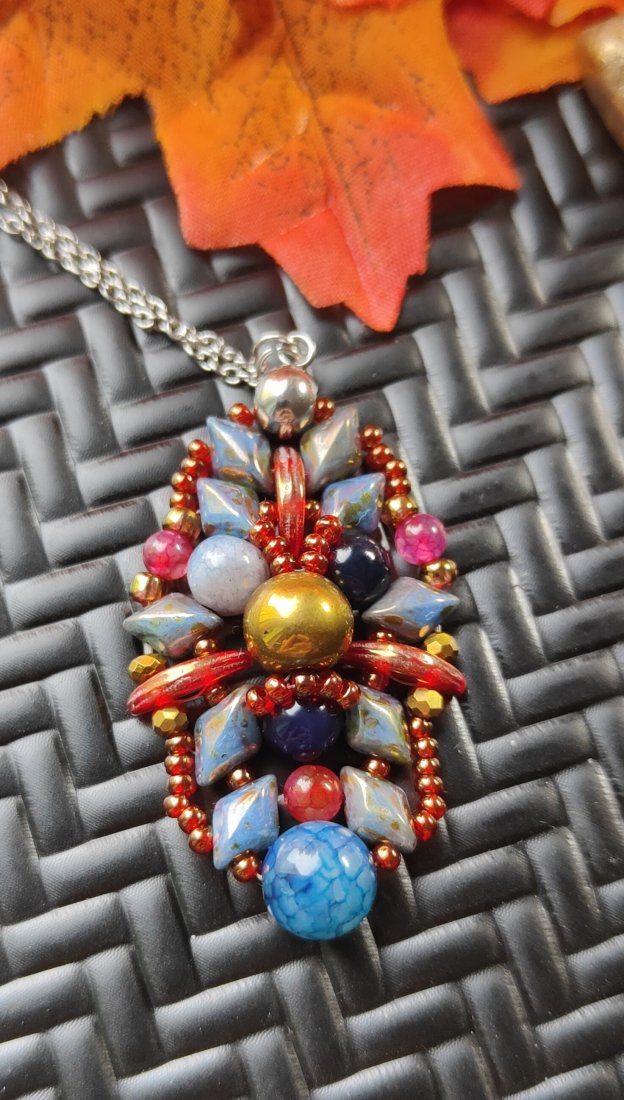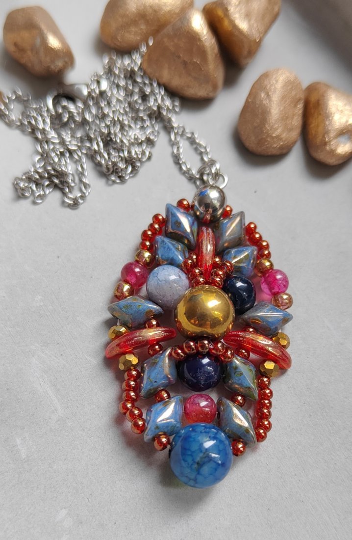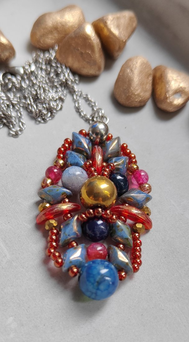 ,, wisior z turmalinem,, to ażurowy wisiorek wykonany z niebieskiego i różowego turmalinu, złotego hematytu a także koralików w różnych odcieniach czerwieni, złota, szarości i niebieskiego. Wisior zawieszony jest na delikatnym łańcuszku wykonanym ze stali szlachetnej.