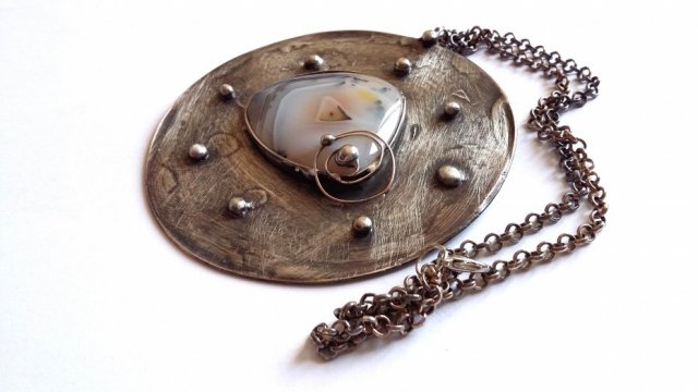 Wisiorek wykonany z miedzi, cyny i agatu. Średnica ok. 8,5 cm. Łańcuszek o długości ok. 45 cm.
