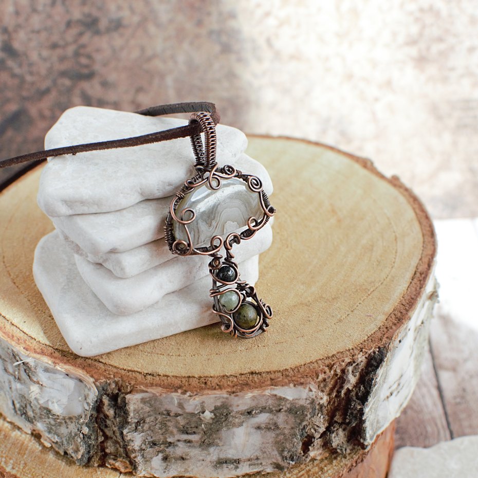 Materiały użyte: drut jubilerski miedziany, agat koronkowy, agat mszysty, turkus afrykański.