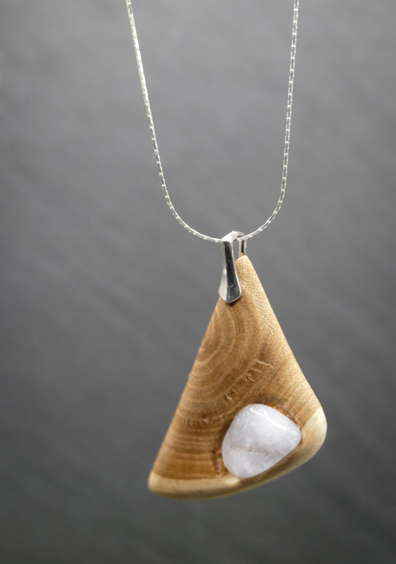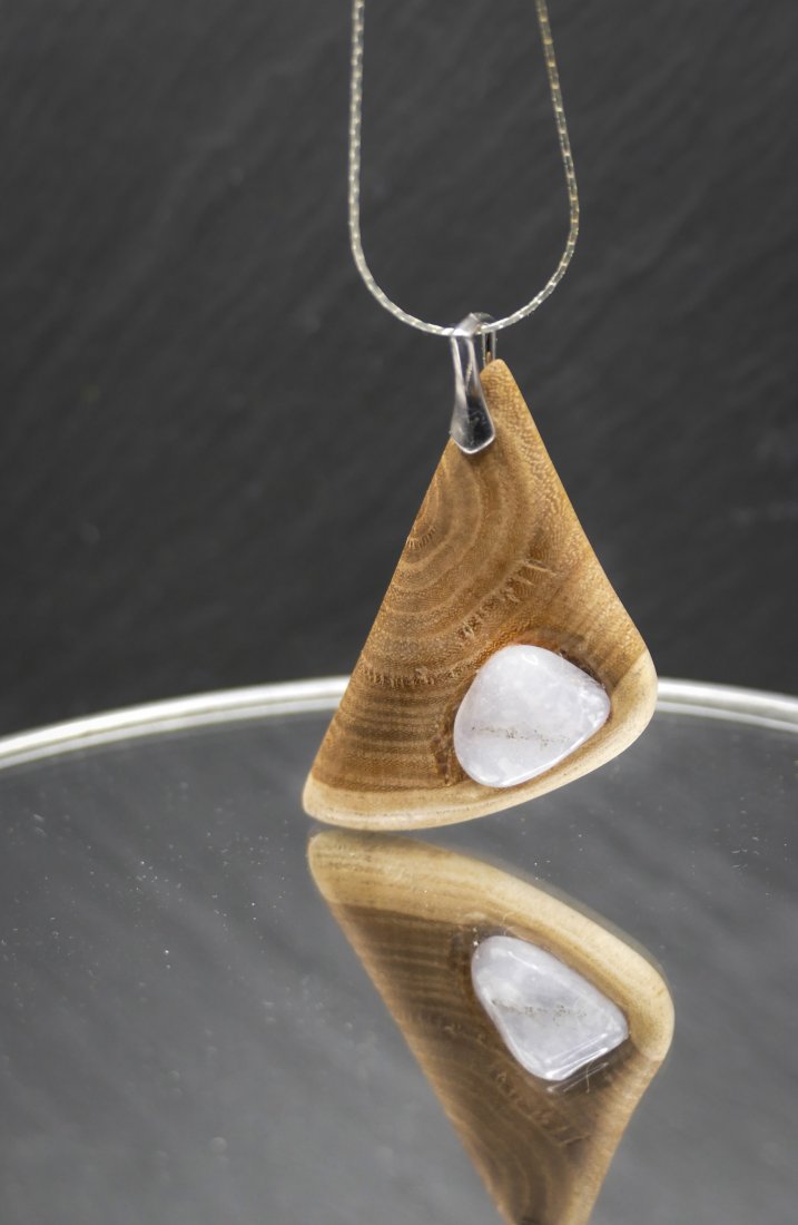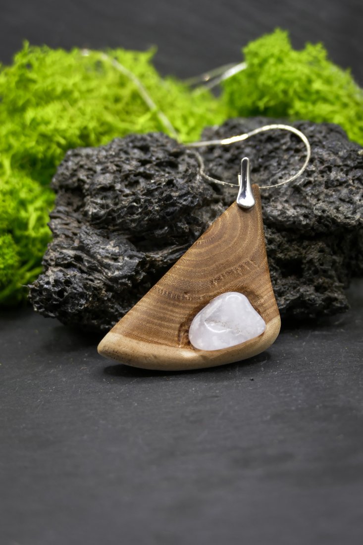 Wisiorek premium wykonany z naturalnego drewna wiązu o wyjątkowo dekoracyjnej strukturze. Forma została ręcznie wyrzeźbiona i międzyludzko opracowana poprzez szlifowanie, woskowanie i polerowanie, co podkreśla głębię koloru i rysunek słojów. Trójkątny, miękko zaokrąglony kształt nadaje projektowi nowoczesny, minimalistyczny charakter.