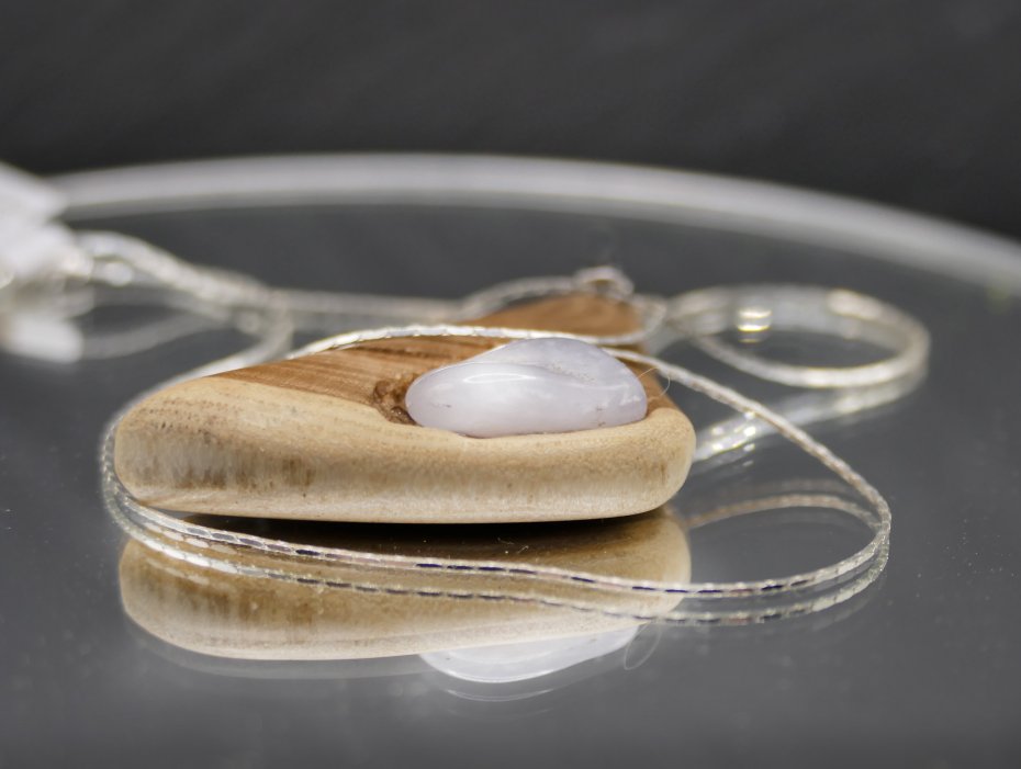 W centralnej części umieszczono akwamaryn, który w połączeniu z ciepłym odcieniem drewna tworzy elegancki kontrast. Całość dopełnia łańcuszek Cardano ze srebra 925 (40 cm) oraz srebrna krawatka rodowana (AG 925).