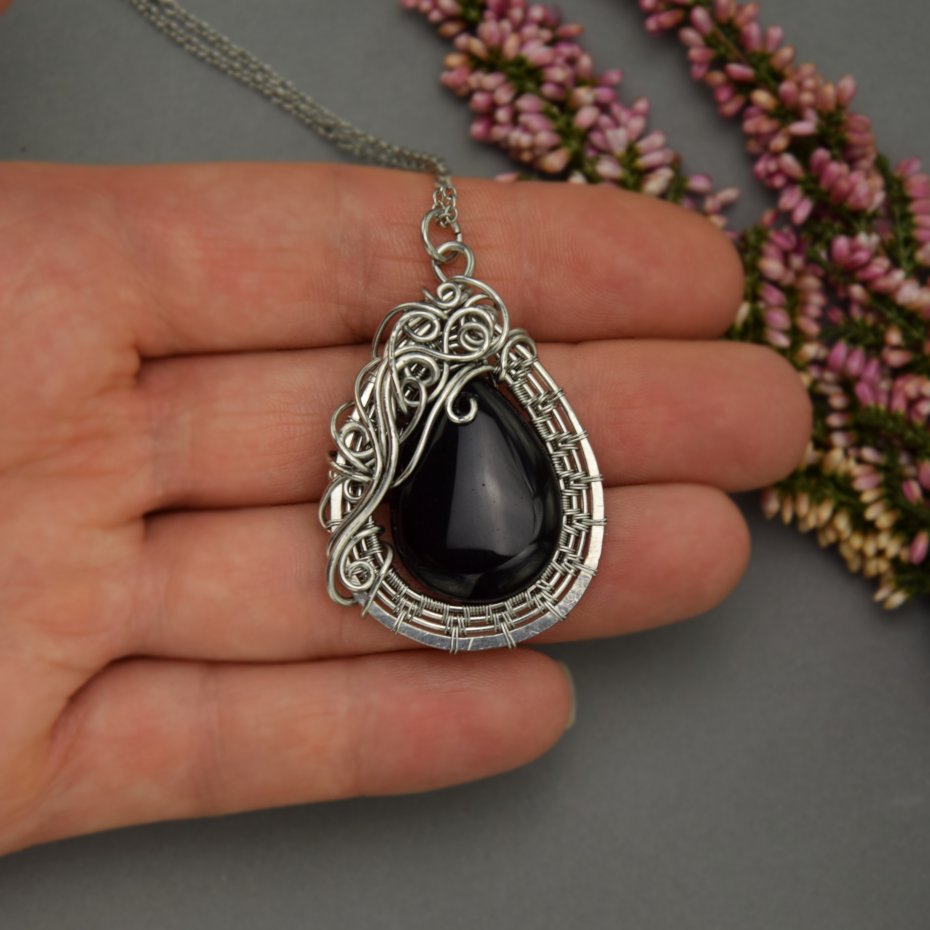 Ręcznie robiony wisiorek z łezką onyksu. Wykonany techniką wire wrapping w całości ze stali chirurgicznej. Część drutów jest młotkowana (spłaszczona przy użyciu młotka). Wisiorek jest unikatowy i obustronny.