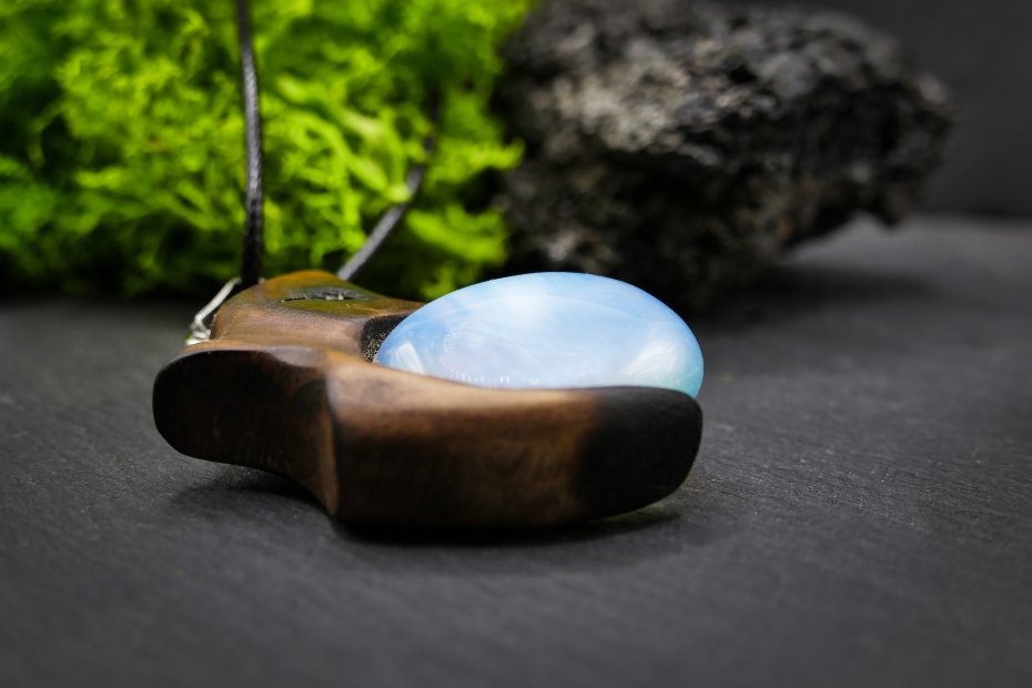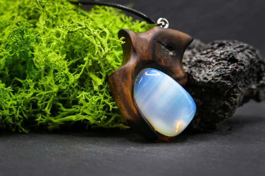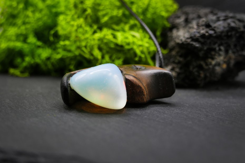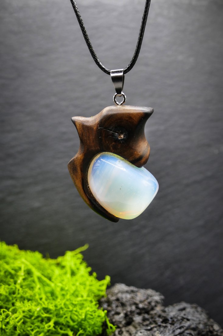Unikalny wisiorek ręcznie wykonany z naturalnego drewna orzecha. Organiczna, ciekawa forma została wyrzeźbiona, bejcowana na głęboki ciemny kolor, a następnie opalana ogniem, woskowana i polerowana, by wydobyć naturalne piękno drewna. W centrum połyskuje duży kwarc opalitowy, nadający biżuterii świetlistości i subtelnego blasku.