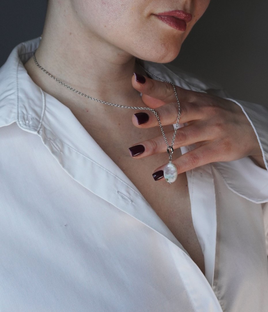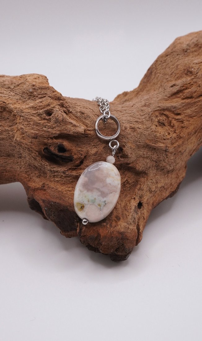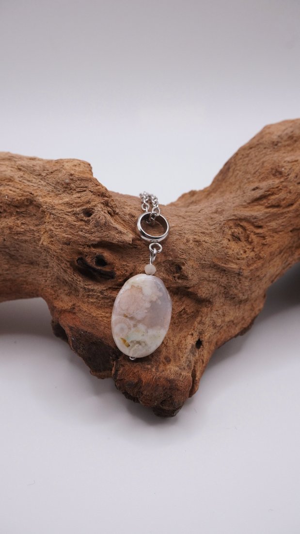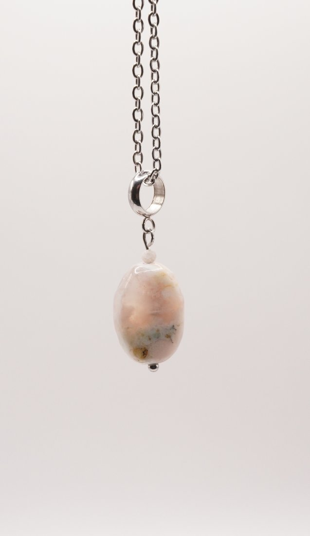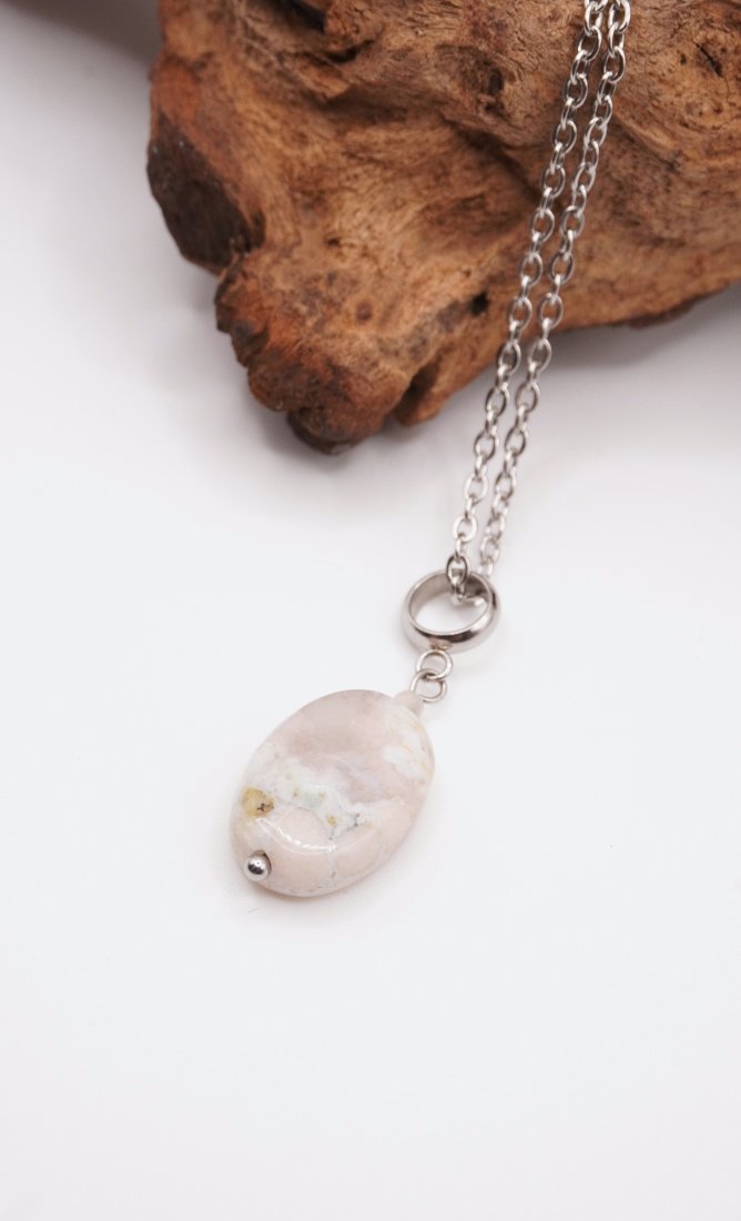 Subtelny naszyjnik wykonany z wysokiej jakości stali szlachetnej, ozdobiony wyjątkowym kamieniem – Agatem Sakura. To biżuteria, która łączy w sobie delikatność estetyczną z niezwykłą wytrzymałością materiałów.