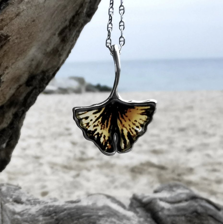 Wspaniały wisiorek inspirowany miłorzębem japońskim. Wykonany ze srebra 925 oraz koniakowego bursztynu bałtyckiego. Ta magiczna roślina nosi w sobie symbolikę siły, witalności, nadziei i braterstwa.