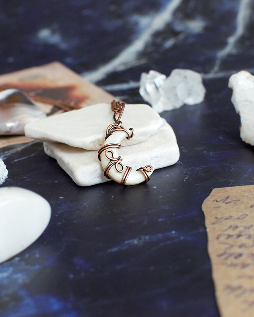 Księżycowy rogalik z kremowej masy perłowej został w fantazyjny sposób oprawiony w naturalną miedź, tworząc niepowtarzalny wisiorek. Opalizacja masy perłowej świetnie komponuje się z formą księżyca.