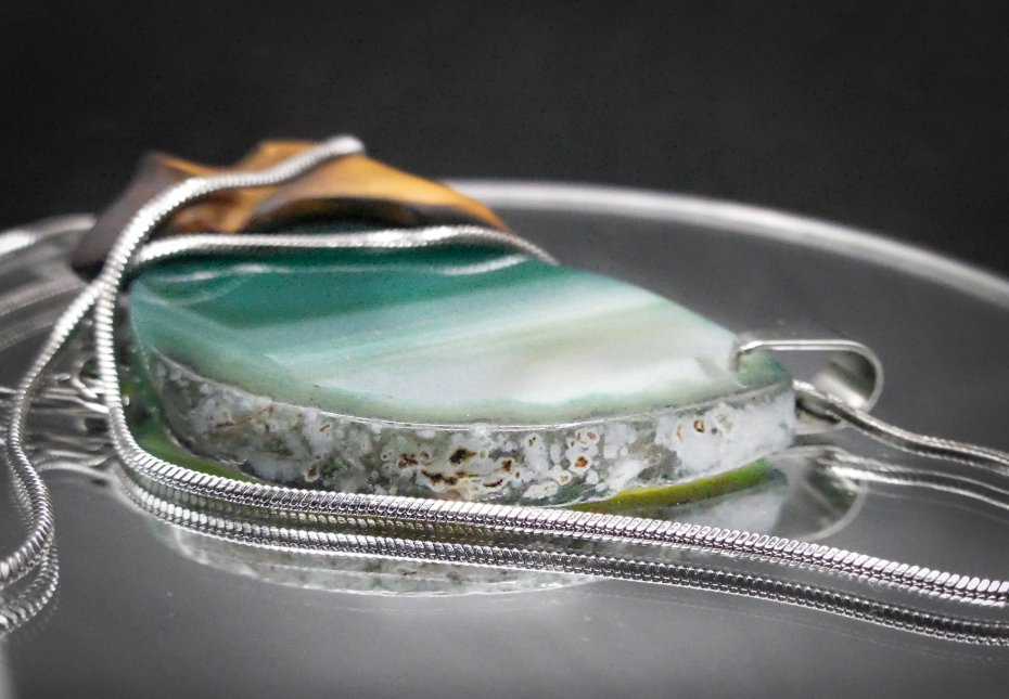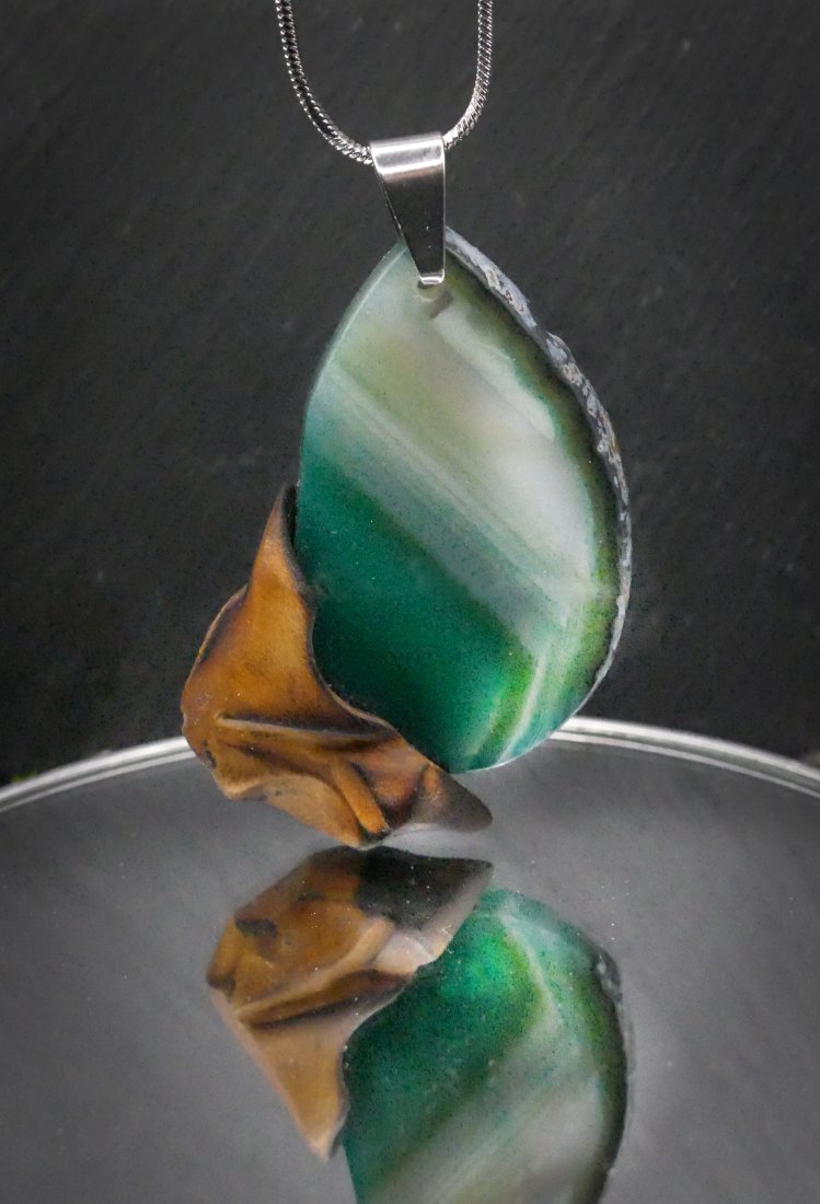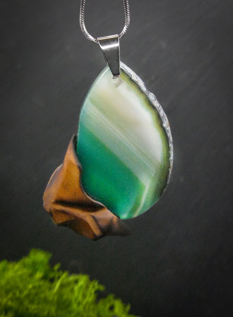 Centralnym elementem jest polerowany plaster zielonego agatu o szklistej, gładkiej powierzchni, osadzony w drewnie niczym naturalna oprawa. Połączenie miękkiej linii drewna i lśniącego kamienia tworzy spójną, nowoczesną formę.