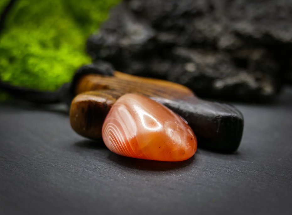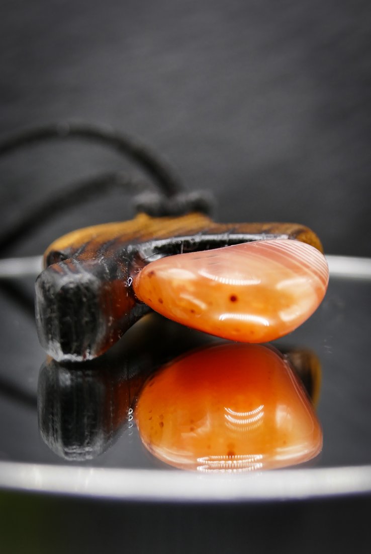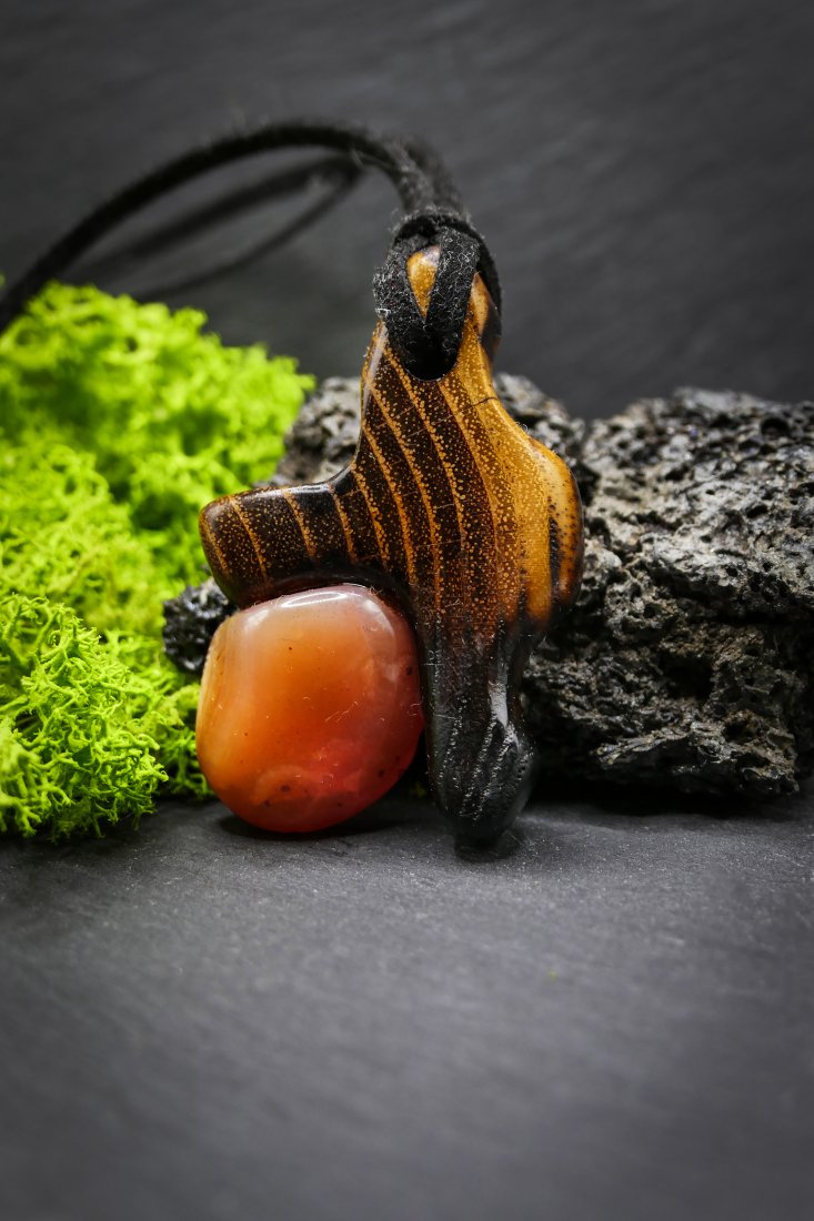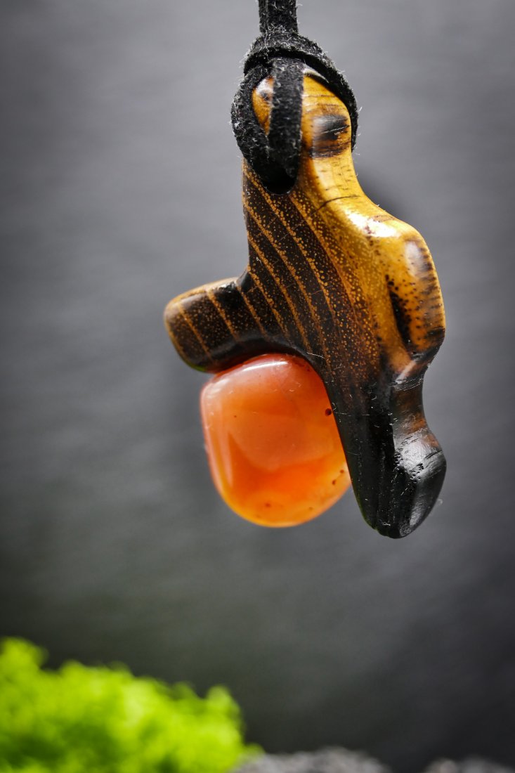 W centrum zawieszki znajduje się pomarańczowy karneol – kamień energii i odwagi.