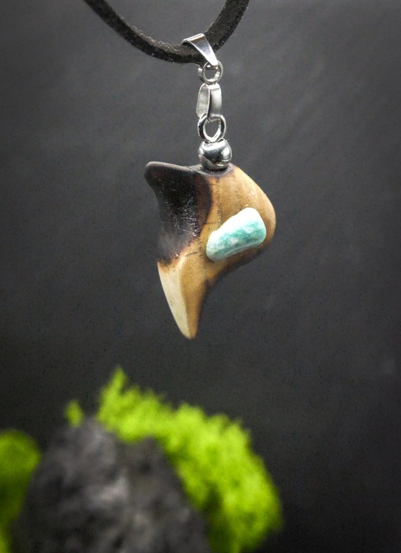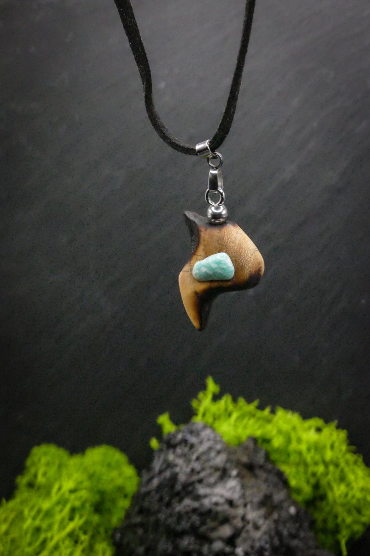 Ozdobą jest drobny amazonit, którego naturalna barwa pięknie współgra z ciepłym odcieniem drewna. Organiczny kształt zawieszki łączy delikatność gładkiego drewna z surowością kamienia.
