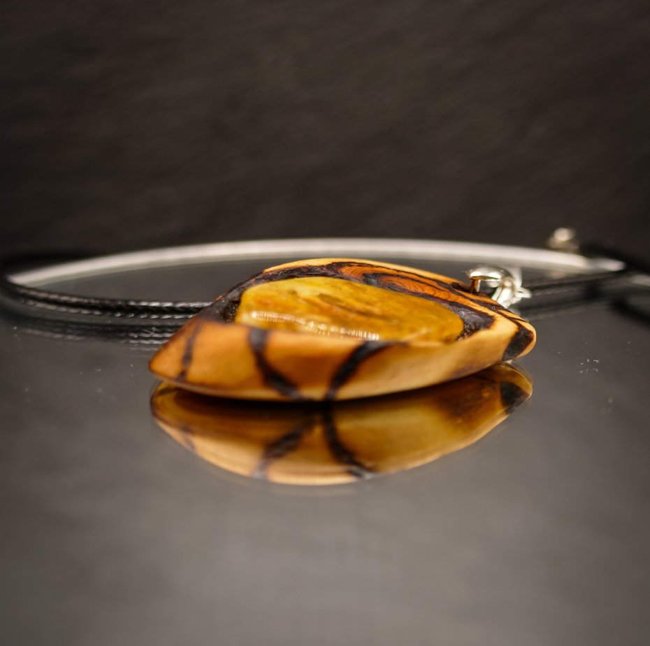 Wisiorek z bursztynem – ręcznie robiony, drewno + żywica