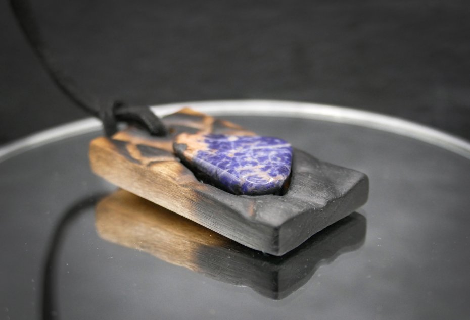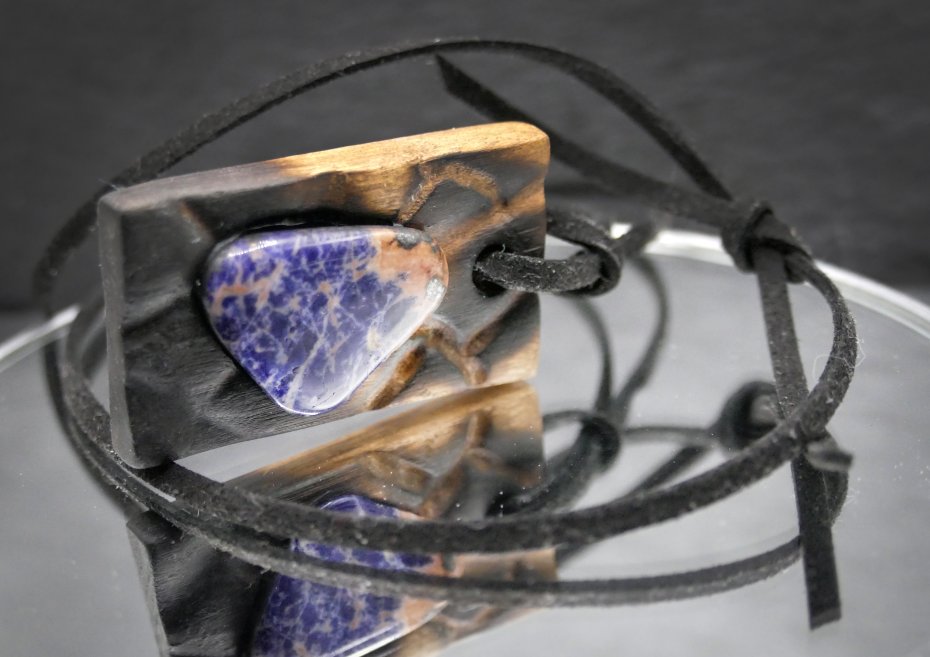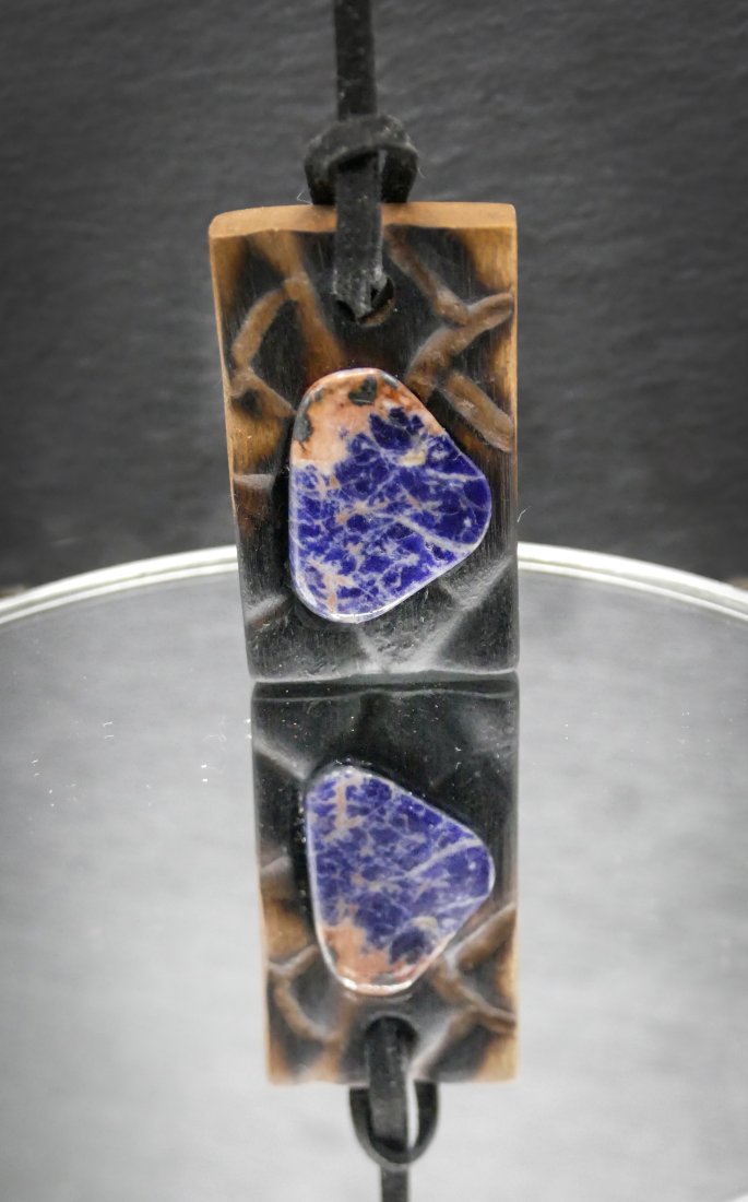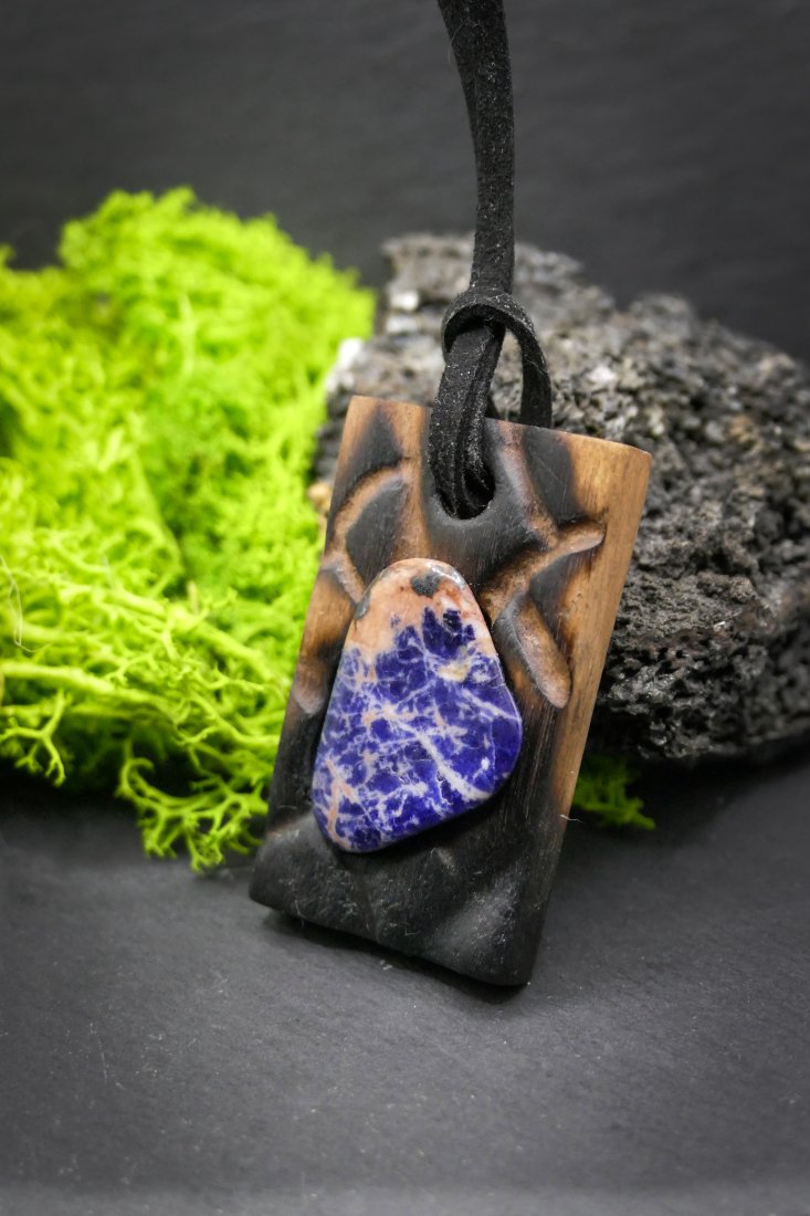 Prostokątny kształt z ręcznymi żłobieniami nadaje całości surowy, organiczny charakter. Ozdobą wisiorka jest naturalny sodalit, delikatnie wkomponowany w drewno.