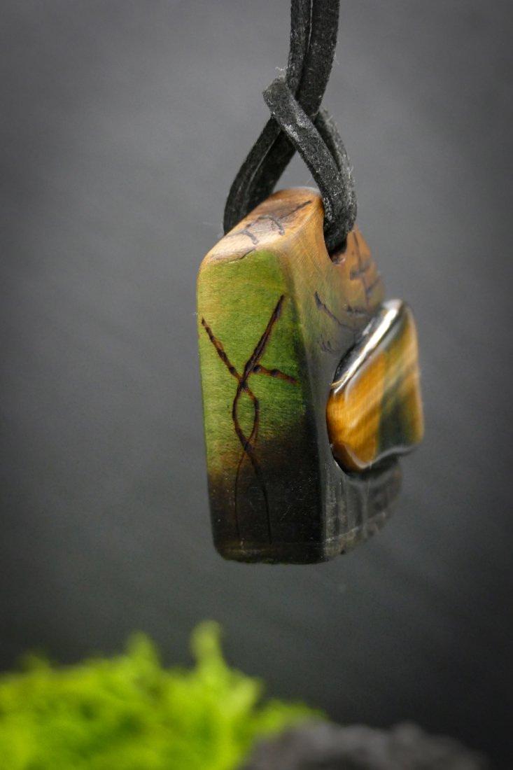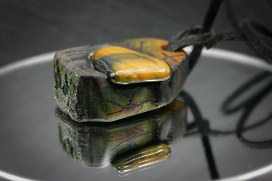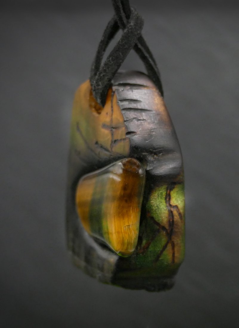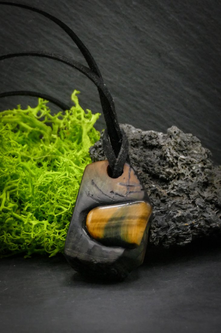 Kamień tygrysie oko pięknie kontrastuje z organiczną strukturą drewna. Wymiary zawieszki: 4 × 3 × 1,5 cm. Całość zawieszona na czarnym rzemieniu (ok. 70 cm) do samodzielnej regulacji.