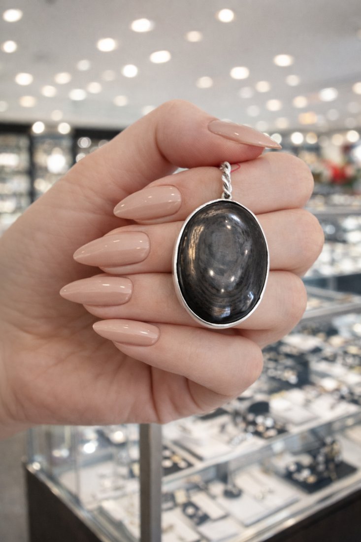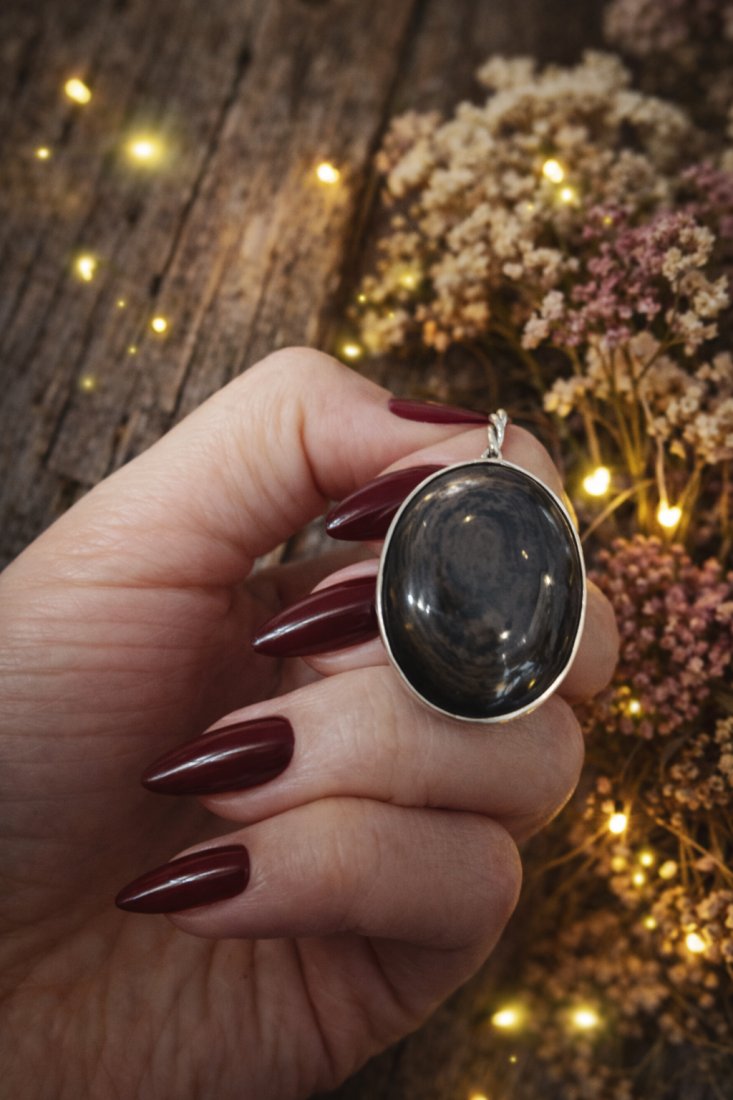 Wyjątkowy wisiorek wykonany ze srebra 925, z pięknym, owalnym kamieniem o głębokiej grafitowo-czarnej barwie. Kamień pięknie odbija światło, tworząc efekt eleganckiego połysku.
