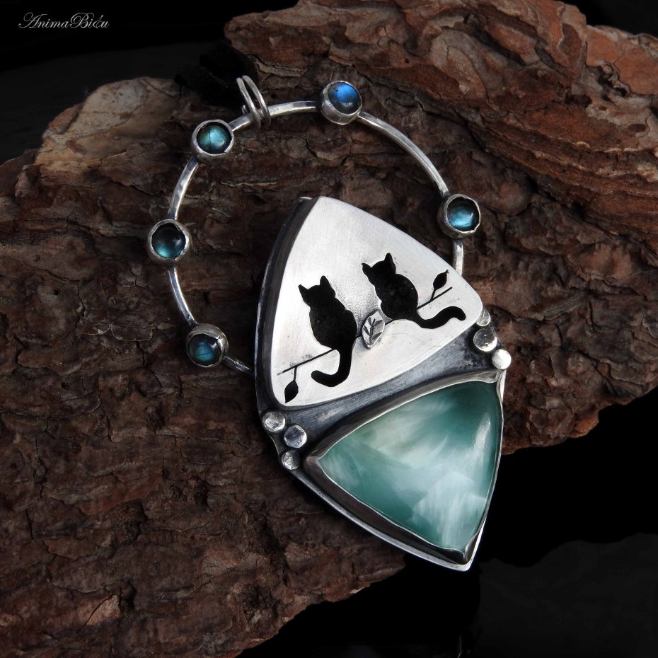 Wisiorek srebrny z hemimorfitem i labradorytami. Wykonany od podstaw ręcznie fantazyjny wisior przedstawia dwa kotki umieszczone pod srebrną łuną na której znajduje się pięć labradorytów. Poniżej kociaków umieściłam trójkątny, niebiański wręcz hemimorfit o błękitnej barwie z charakterystycznymi perłowymi smugami. Do wyrobu użyłam srebra próby 925 i 999, które przyciemniłam i przetarłam. Wisiorek waży 23,6 gramów, jest długości 75 mm i szerokości 44 mm. Technika wykonania: lutowanie i młotkowanie. Wisiorek został ocechowany w Urzędzie Probierczym. Wisiorek zawiesiłam na czarnym, zamszowym rzemyczku o długości 48 cm ze srebrnym zapięciem (próba 925).