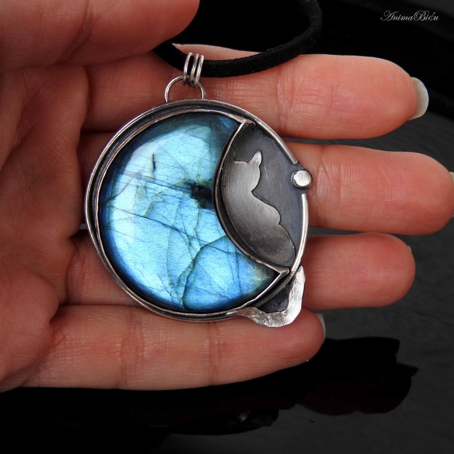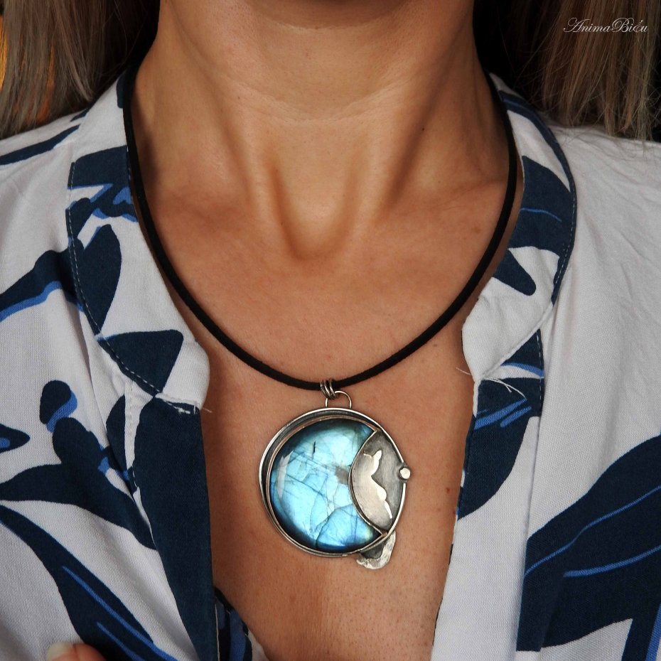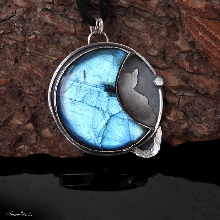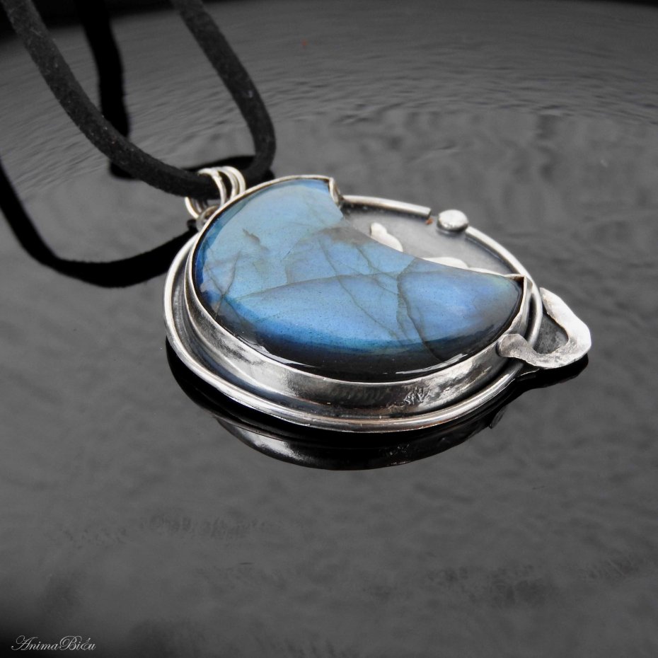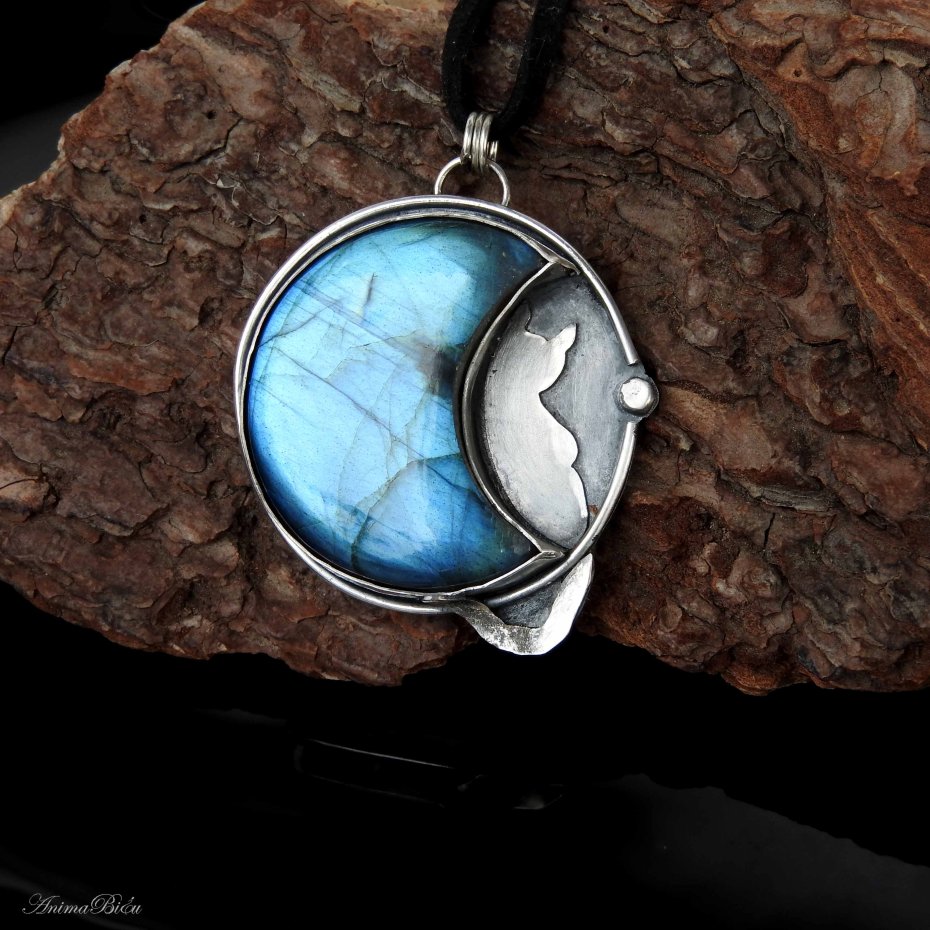 Wisiorek srebrny z labradorytem. Wykonany od podstaw ręcznie wisior powstał ze srebra próby 925 i 999. Sercem ozdoby jest majestatyczny labradoryt o niezwykłej, niebieskiej iryzacji i kształcie księżyca. Obok niego umieściłam wtulonego w księżyc srebrnego kociaka z zawiniętym ogonkiem. Srebro przyciemniłam, częściowo przetarłam, częściowo wypolerowałam. Długość wisiorka: 52mm, szerokość: 43 mm. Waga: 21,7g, w tym srebro 9,13g. Technika wykonania: lutowanie, młotkowanie. Do wisiorka dołączam czarny, zamszowy rzemyczek długości 48 cm ze srebrnym zapięciem (próba 925). Cechowany w Urzędzie Probierczym.