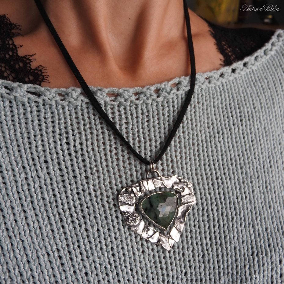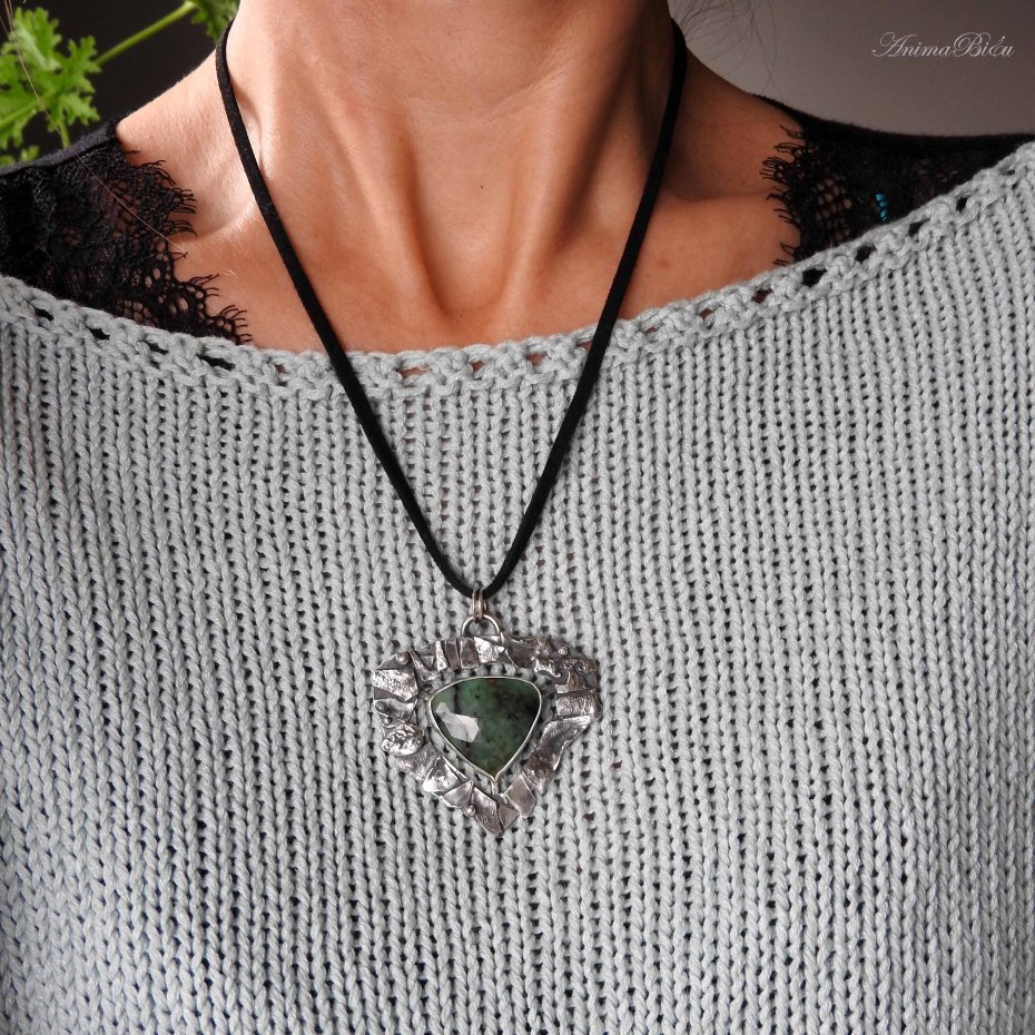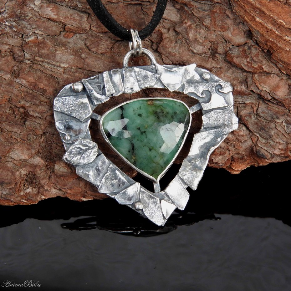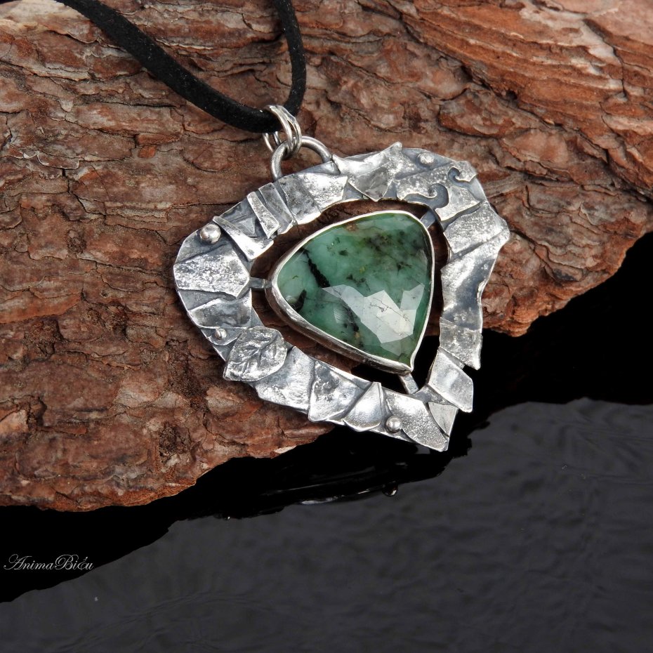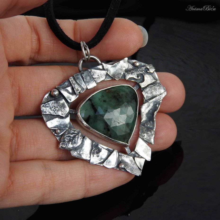 Wisiorek srebrny ze szmaragdem. Wisiorek został wykonany od podstaw ręcznie ze srebra próby 925 i 999. Oprawa utrzymana jest w dość surowym stylu, składają się na nią liczne fragmenty srebra w różnym kształcie, które fakturowałam, przyciemniłam i wypolerowałam. Serce wisiorka - fasetowany zielony szmaragd z czarnymi wtrąceniami – umieściłam po środku. Technika wykonania: lutowanie, młotkowanie. Długość wisiorka wynosi 50 mm, szerokość 48 mm. Waga wynosi 13,8g, w tym srebro 11g. Cechowany w Urzędzie Probierczym. Wisiorek zawiesiłam na czarnym, zamszowym rzemyczku o długości 48 cm ze srebrnym zapięciem (próba 925).