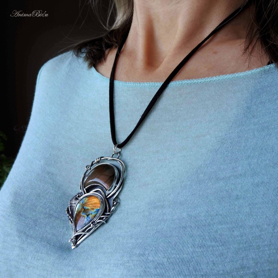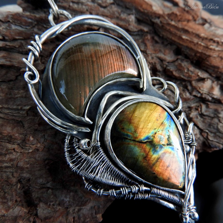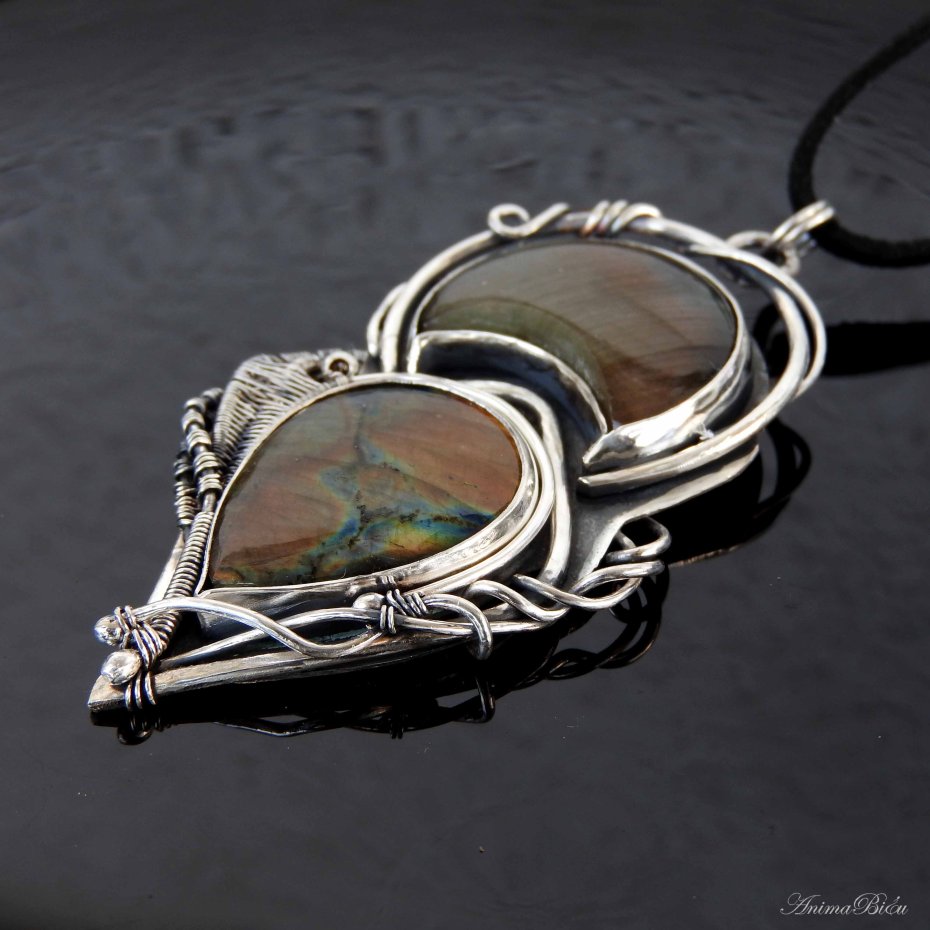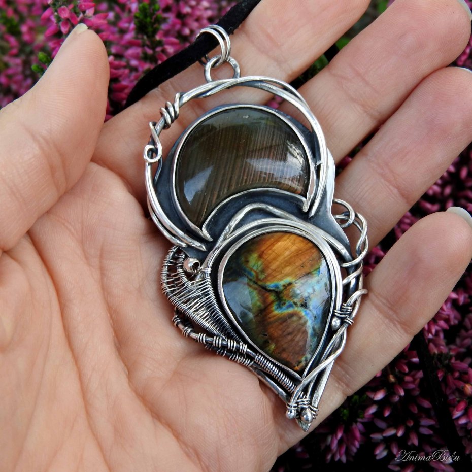 Wisiorek srebrny z labradorytem i spektrolitem. Na ten wisior składają się dwa piękne minerały. Oba w odcieniach złota, a jednak jak bardzo różne. Górny półksiężyc to pasiasty, miodowy labradoryt z nutka różu, tajemniczy, ujawnia swą iryzację przy odpowiednim ustawieniu światła. Dolna łezka minerału to spektrolit, odmiana labradorytu wykazująca wyjątkowo piękną i intensywną migotliwą grę barw we wszystkich odcieniach tęczy. Występuje gównie w Finlandii w pobliżu jeziora Oulujarvi. Ten w wisiorku jest barwy pomarańczowego złota z kilkoma błękitnymi żyłkami. Oprawiłam je w srebro próby 925 i 999 przy wykorzystaniu techniki lutowania, młotkowania i pracochłonnego wire wrappingu. Kamienie otoczone są asymetrycznymi zawijasami i wyplotami. Dla podkreślenia zdobień srebro przyciemniłam, a następnie wypolerowałam na lustro. Długość wisiorka wynosi 75 mm, szerokość 35 mm, waga 25,3 grama, w tym 15g srebra. Wisiorek zawiesiłam na czarnym, zamszowym rzemyczku długości 48 cm ze srebrnym zapięciem (próba 925).