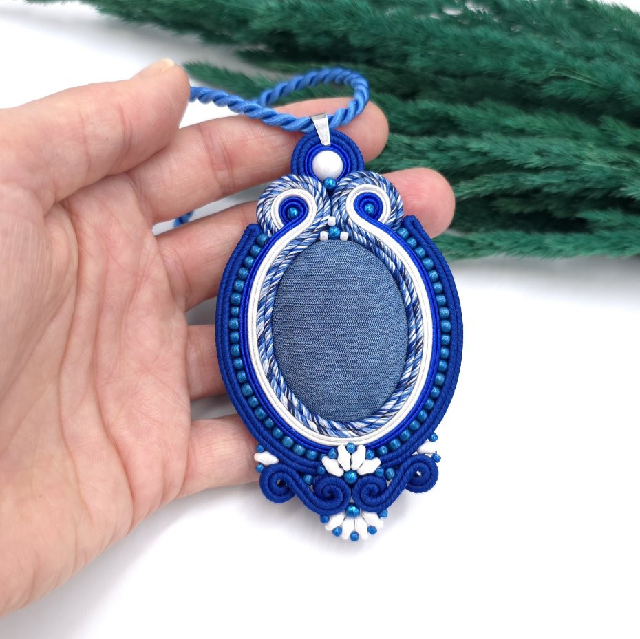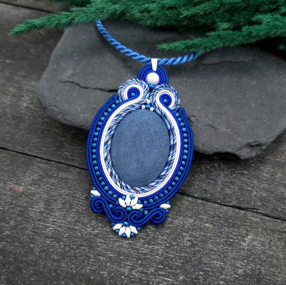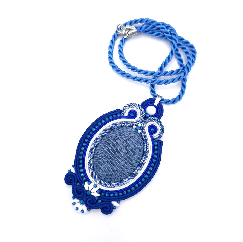 Ten wyjątkowy wisiorek został wykonany techniką sutasz i ozdobiony centralnym elementem z dżinsu, co nadaje mu nowoczesny, a zarazem casualowy charakter.