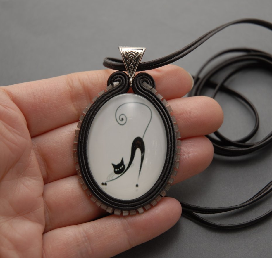 oferuję wisiorek zrobiony techniką sutasz, ozdobiony kaboszonem z kotem i koralikami
