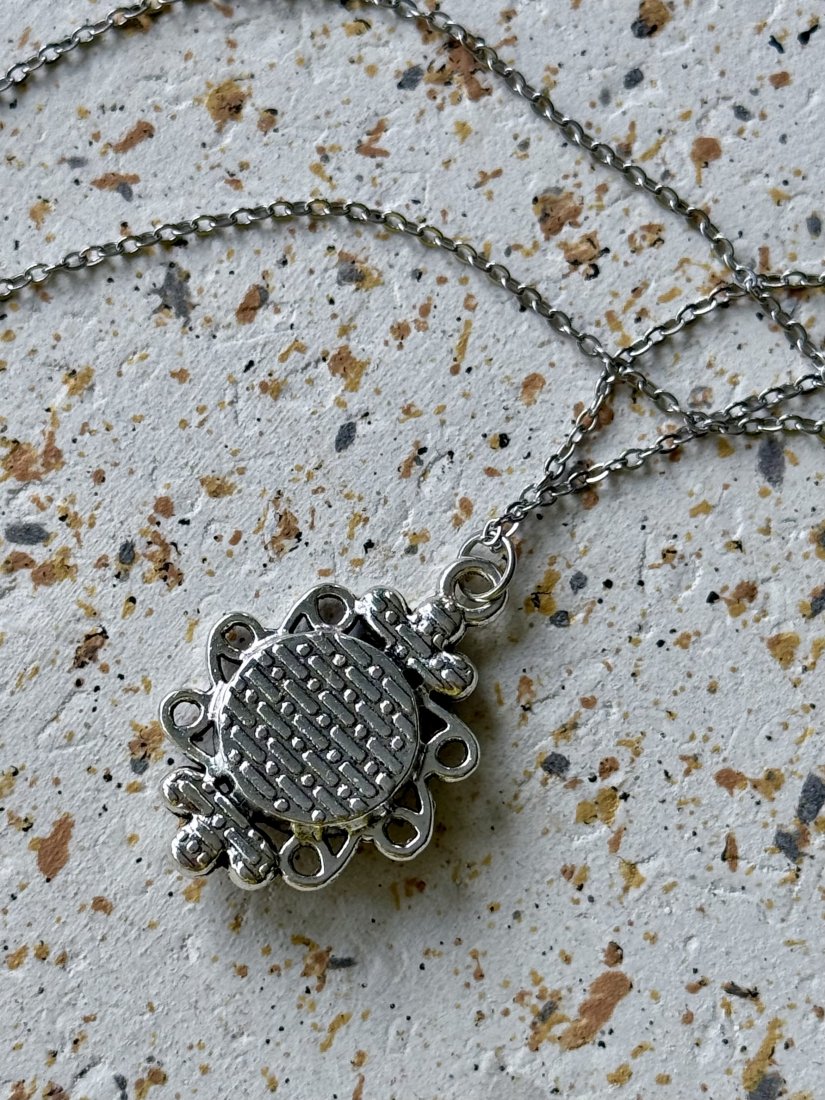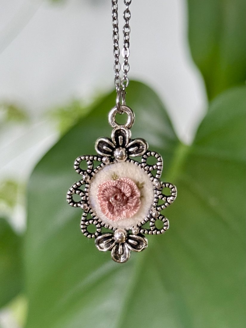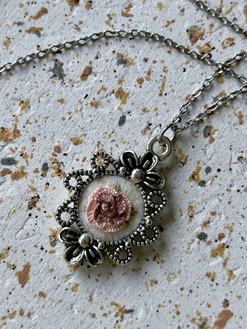 W centrum tego uroczego naszyjnika uwagę przyciąga maleńki, ręcznie haftowany kwiat osadzony w dekoracyjnej ramce o wysokości ok. 3 cm. Naszyjnik wygląda jak element biżuterii z minionej epoki.