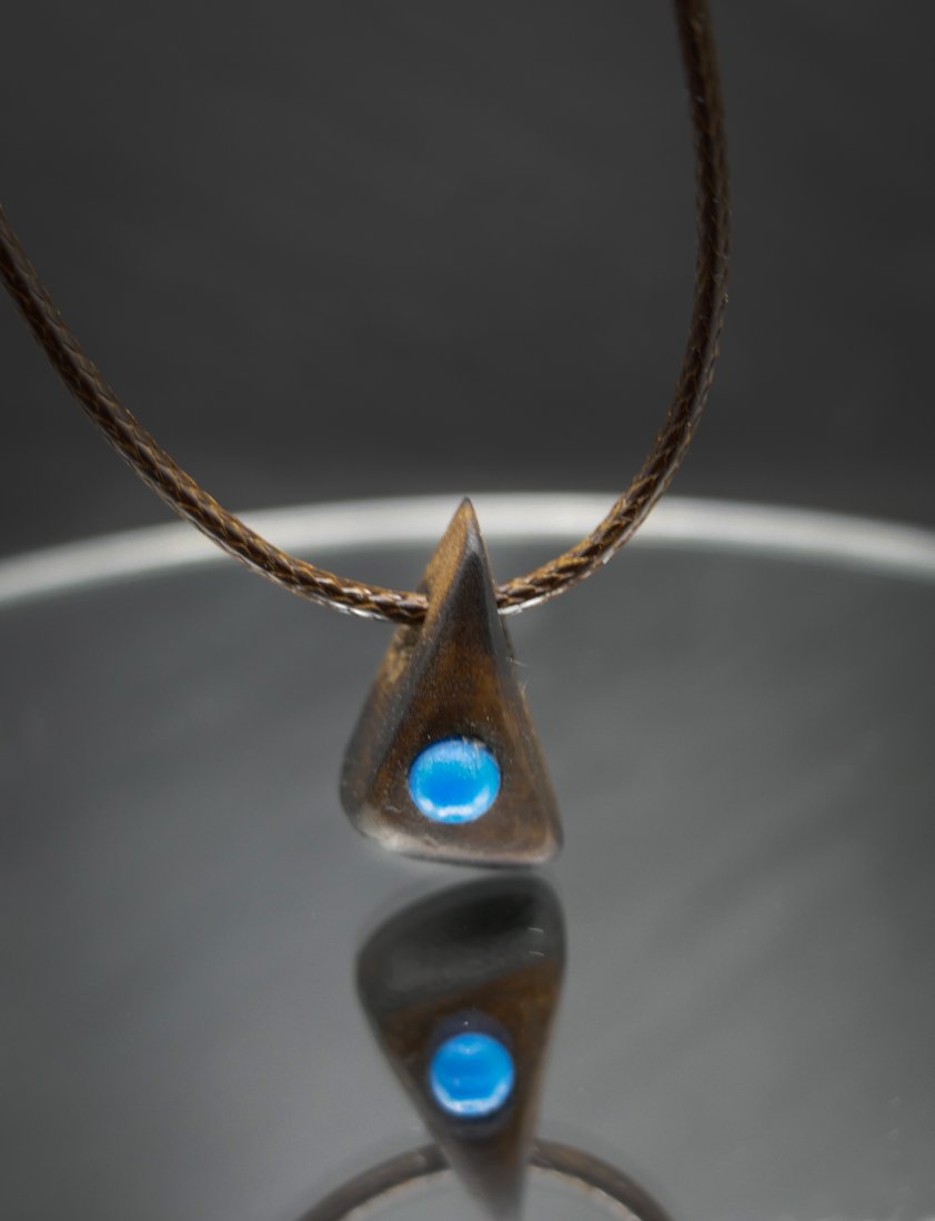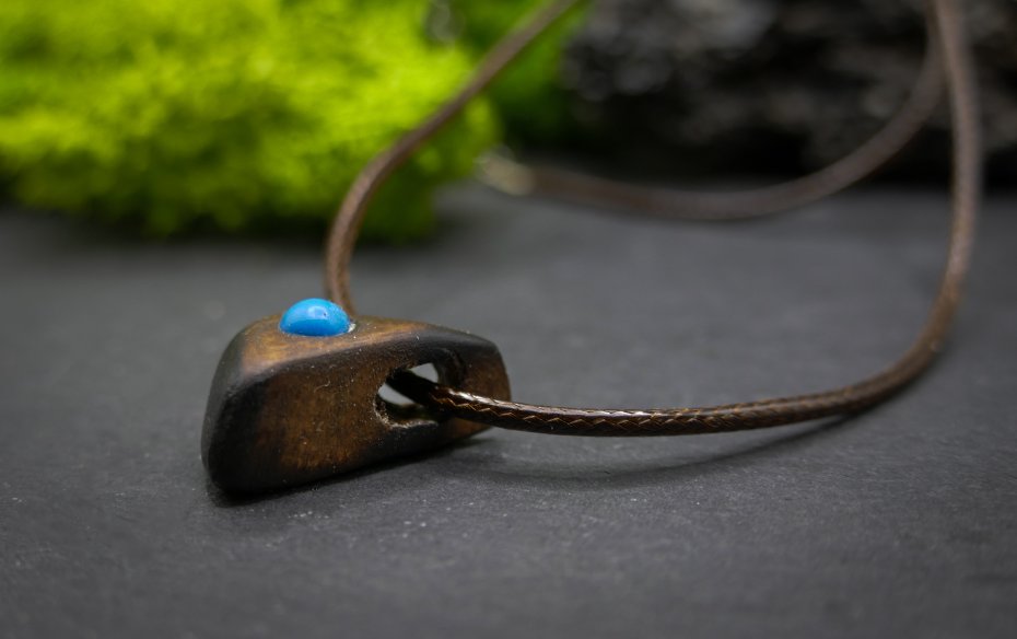 Drewniany wisiorek trójkątny z turkusem afrykańskim – rękodzieło