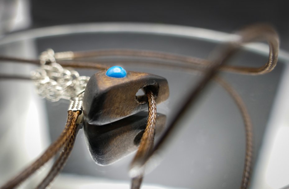 Minimalistyczna biżuteria inspirowana naturą. Wisiorek z naturalnej brzozy w formie małego trójkąta. Drewno zostało ręcznie opalone ogniem, bejcowane na ciemny orzech i zabezpieczone naturalnym woskiem. W centrum – drobny koralik z turkusu afrykańskiego, który dodaje całości koloru i symbolicznej mocy.