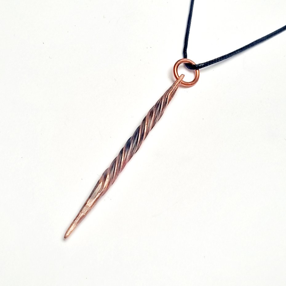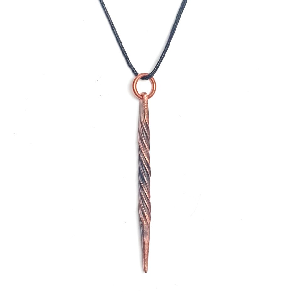 Wisiorek wykonany z czystej, polskiej miedzi z kawałka pręta odpowiednio walcowanego, kutego i skręcanego. Naturalna oksyda ogniowa nadająca mu antycznego charakteru. Ręcznie przecierany. Podobne wisiorki nosili Wikingowie, dla których stanowił amulet ochronny i był jednocześnie narzędziem do pisania run na glinianych płytkach.