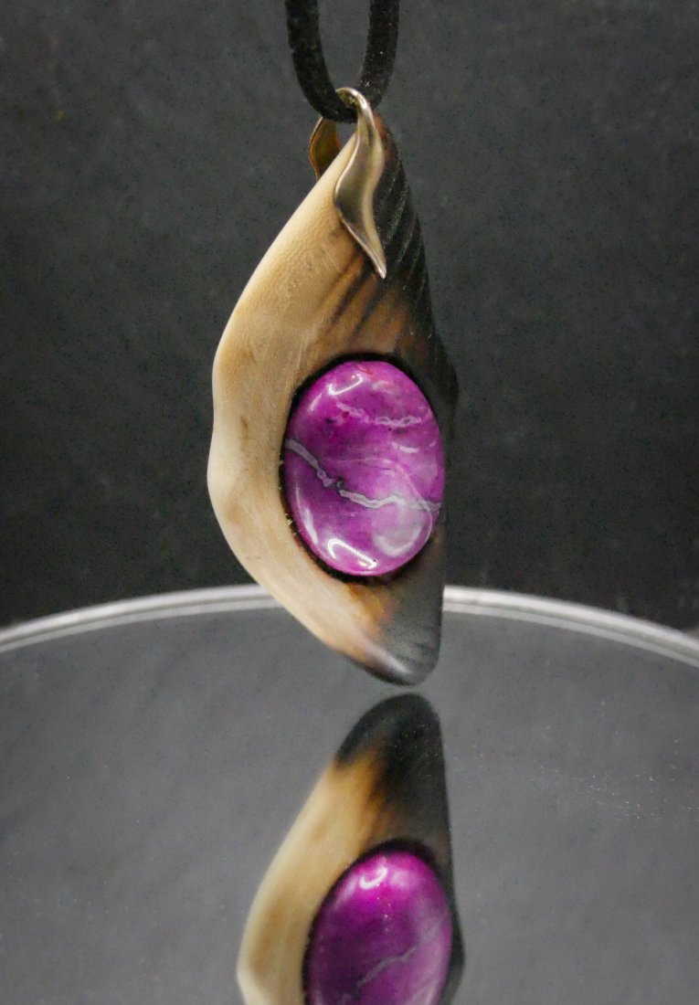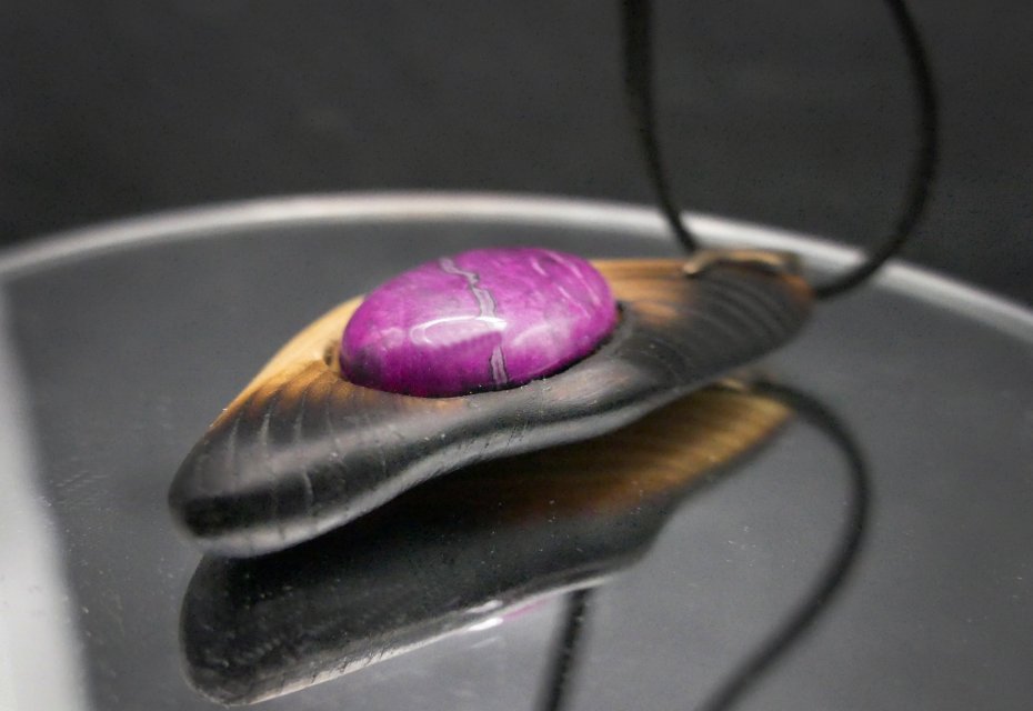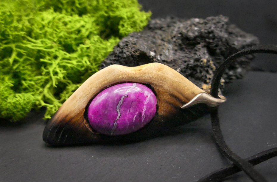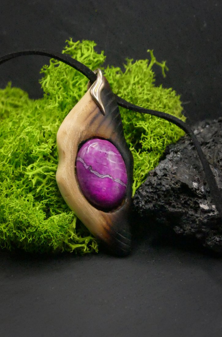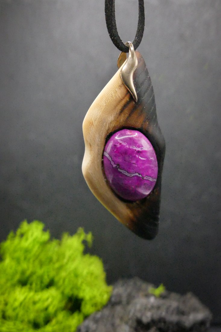 Centralnym punktem jest piękny agat w odcieniach różu i magenty, który subtelnie łączy się z naturalnym drewnem.