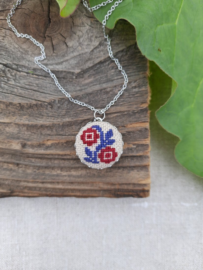Wisiorek z karpackim haftem krzyżykowym w kolorze bordowo-granatowym. Haft wykonałam ręcznie na bawełnianej kanwie w kolorze piaskowym.