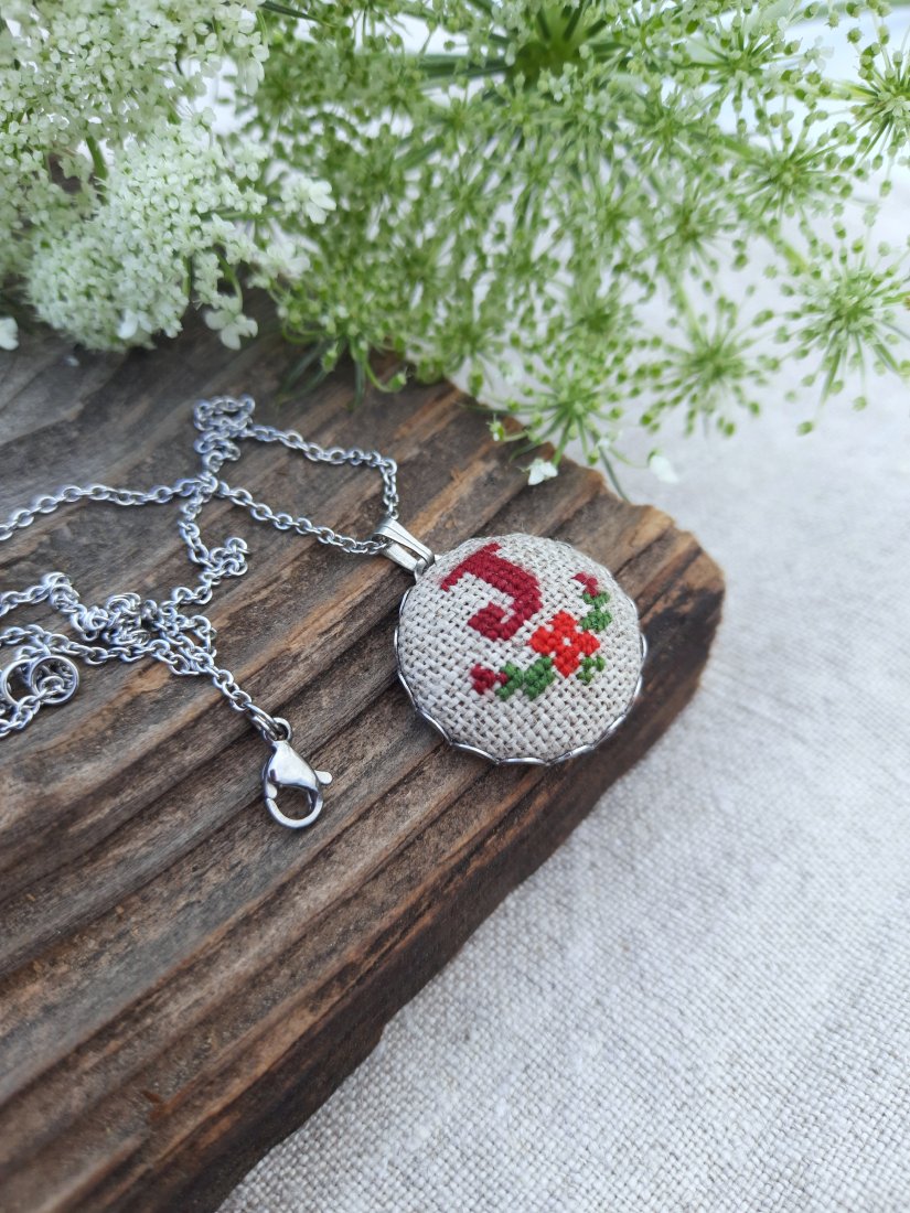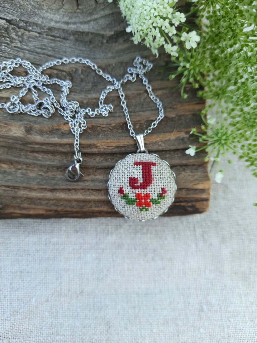 Wisiorek z wyhaftowaną literą J. Haft wykonałam ręcznie na lnianej tkaninie.