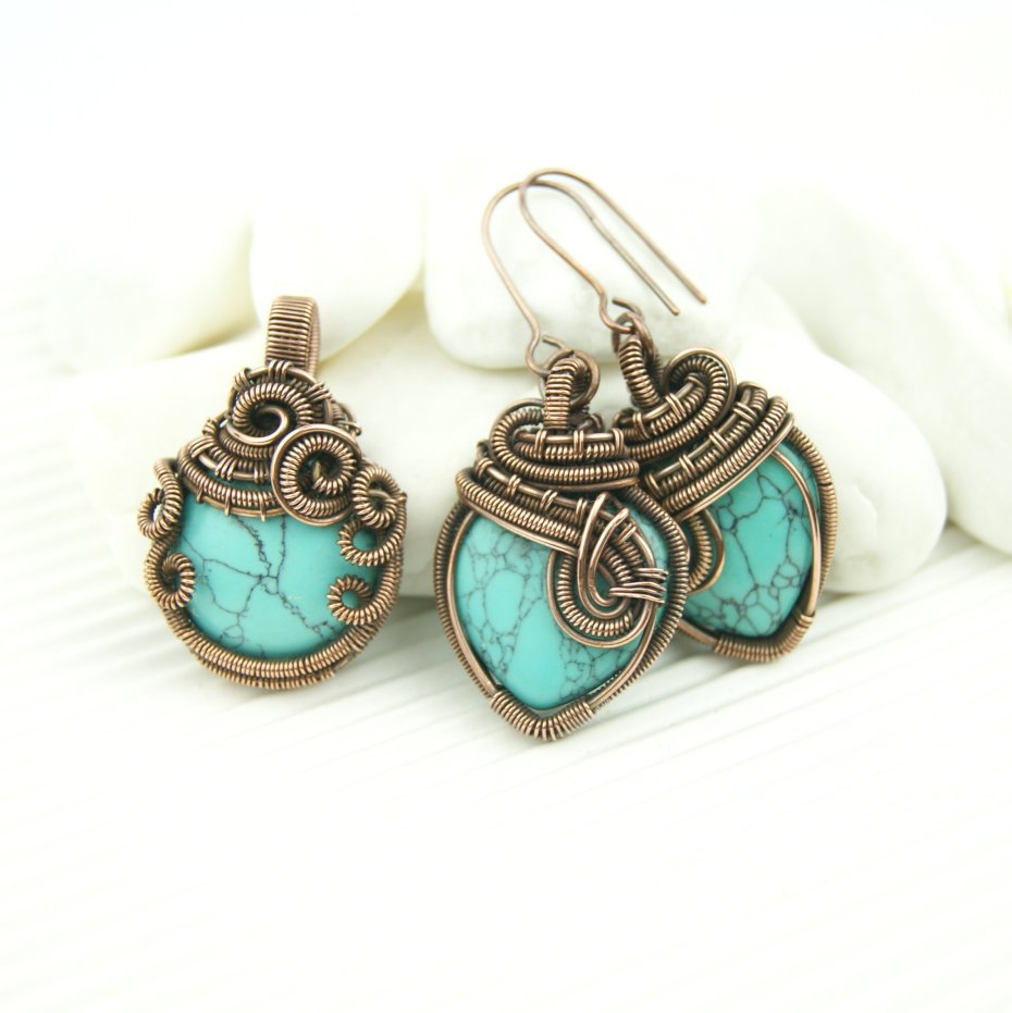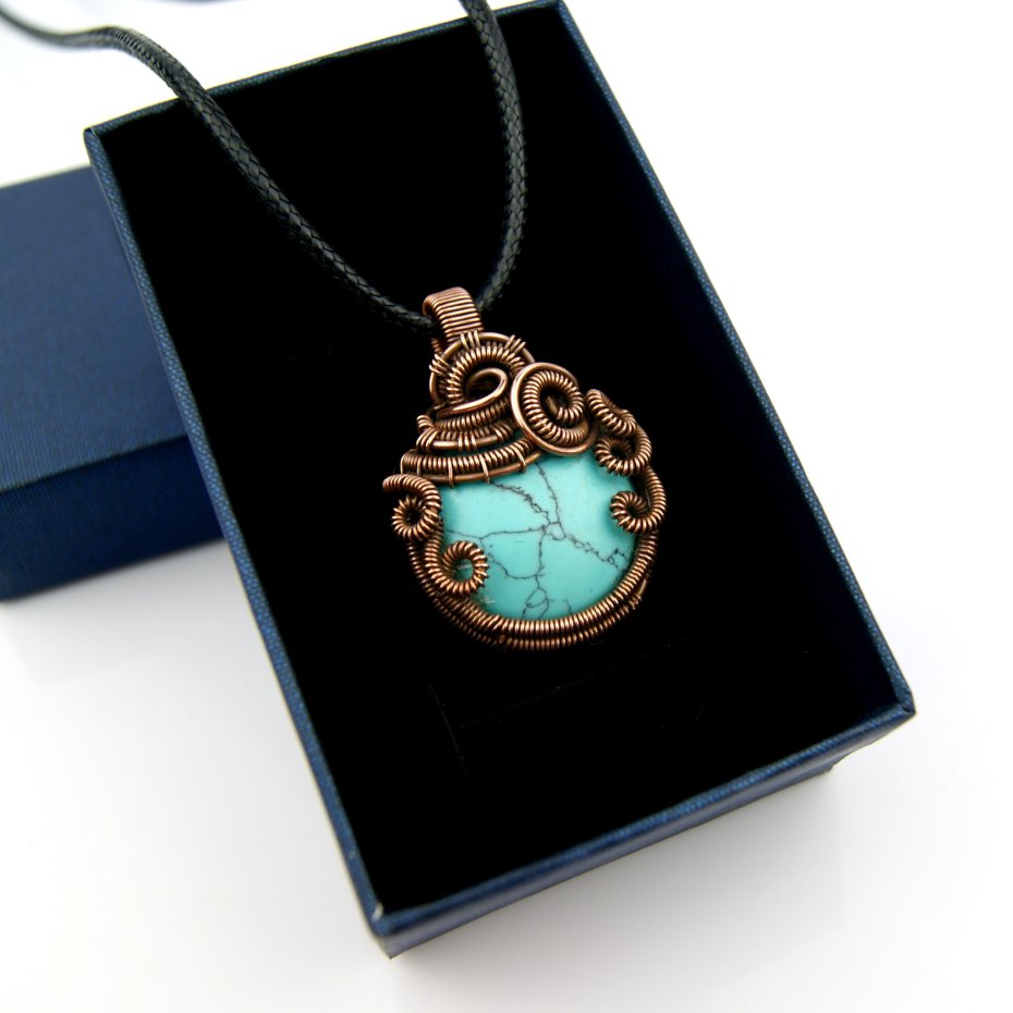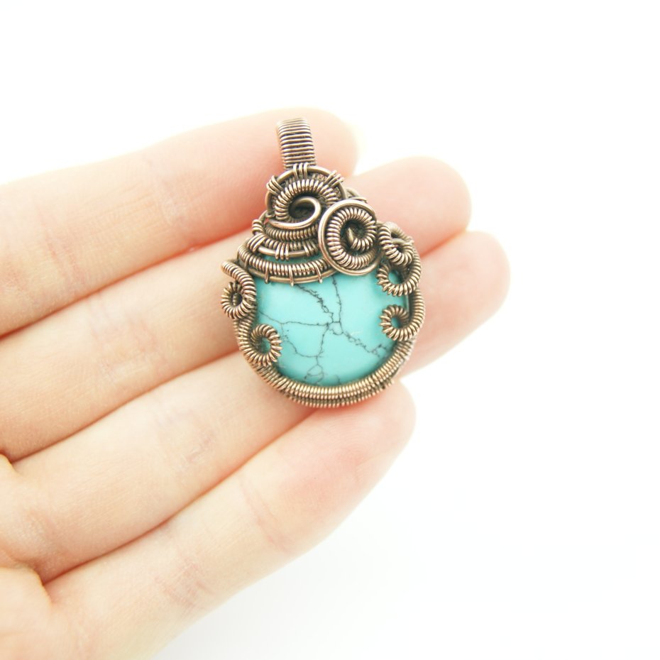 Wisiorek powstał z turkusowego howlitu. Kamień otrzymał misternie plecioną, miedzianą oprawę. Biżuteria wykonana techniką wire wrapping, oksydowana.