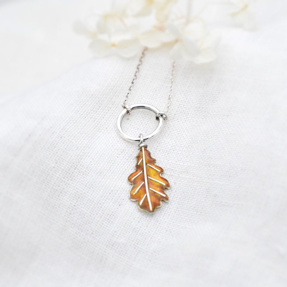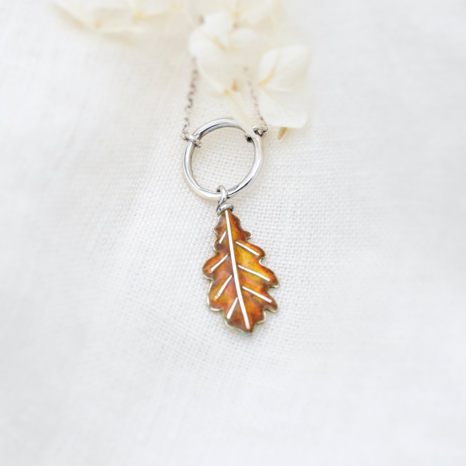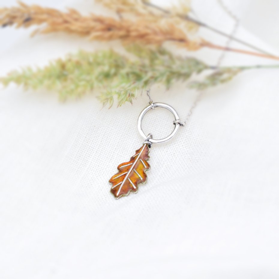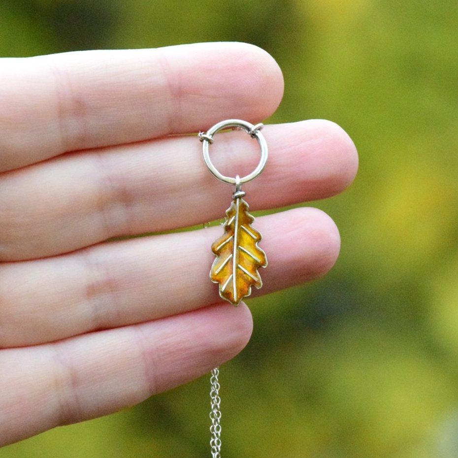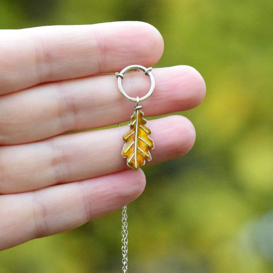Subtelny i kobiecy naszyjnik inspirowany złotą jesienią. Dębowy listek, wykonany ze srebra i pokryty emalią jubilerską, przyciąga uwagę ciepłym, jesiennym blaskiem.