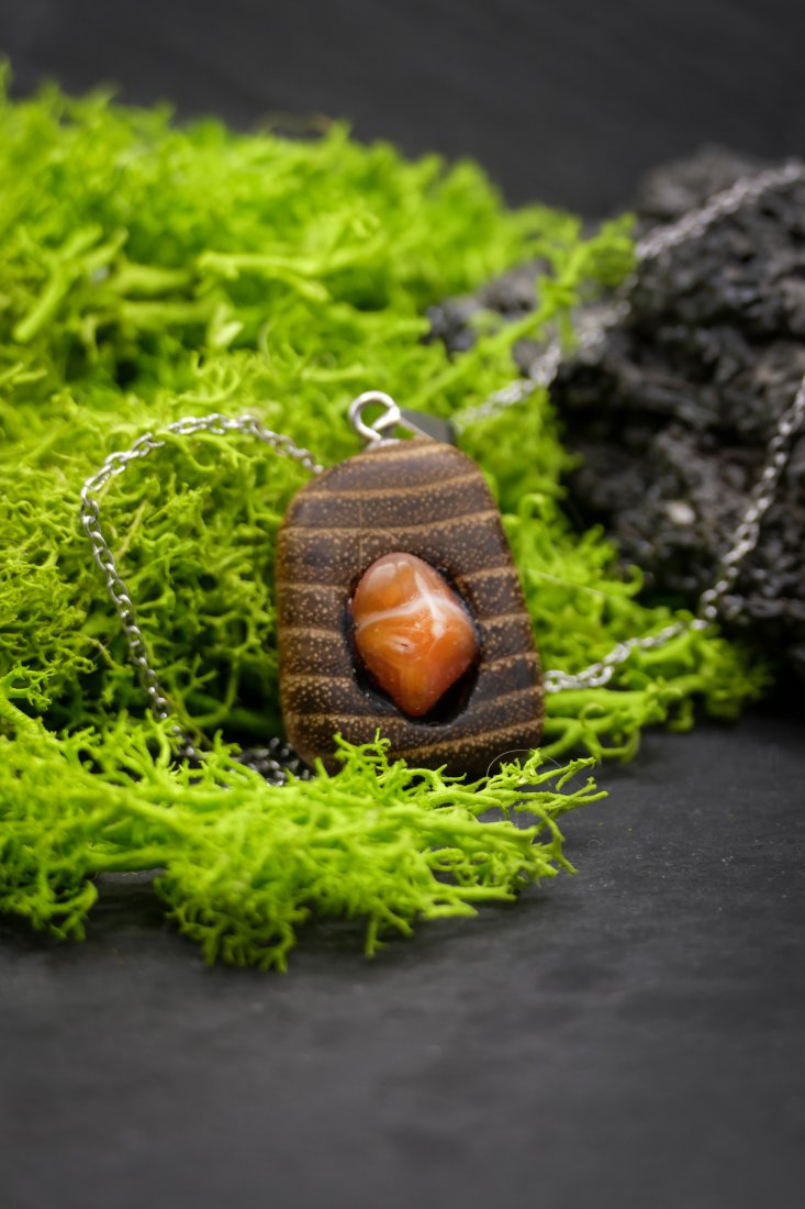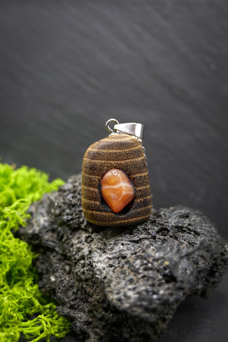 Centralnym akcentem biżuterii jest drobny karneol, który dodaje minimalistycznej formie ciepłego koloru.