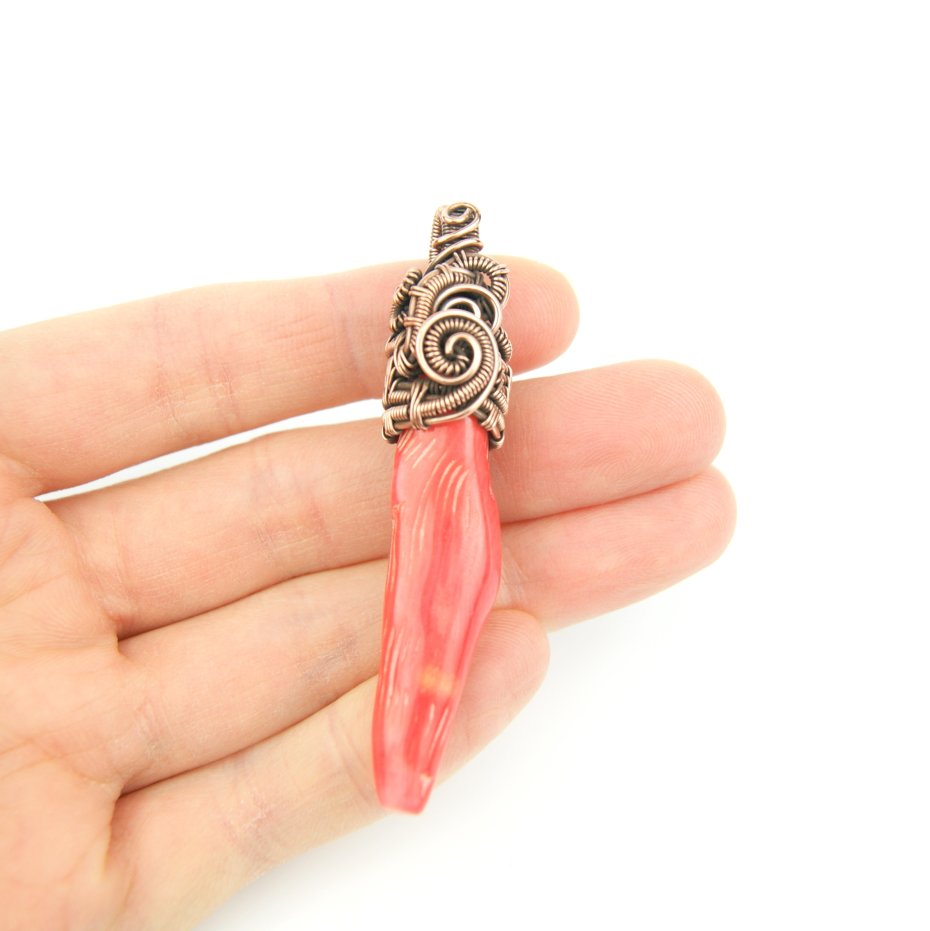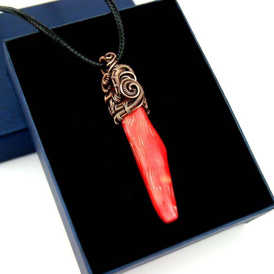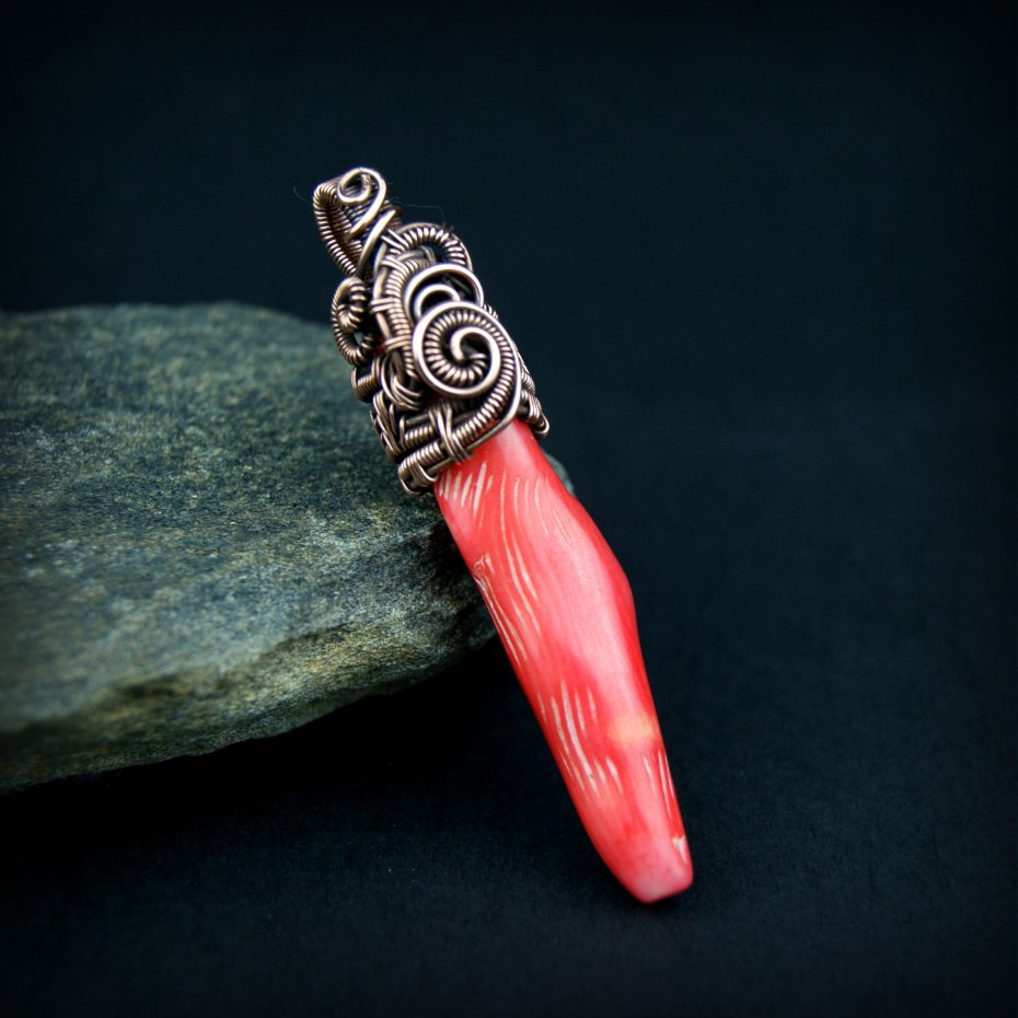 Wisiorek powstał z gałązki korala o nieregularnym kształcie. Całość misternie opleciona miedzią.