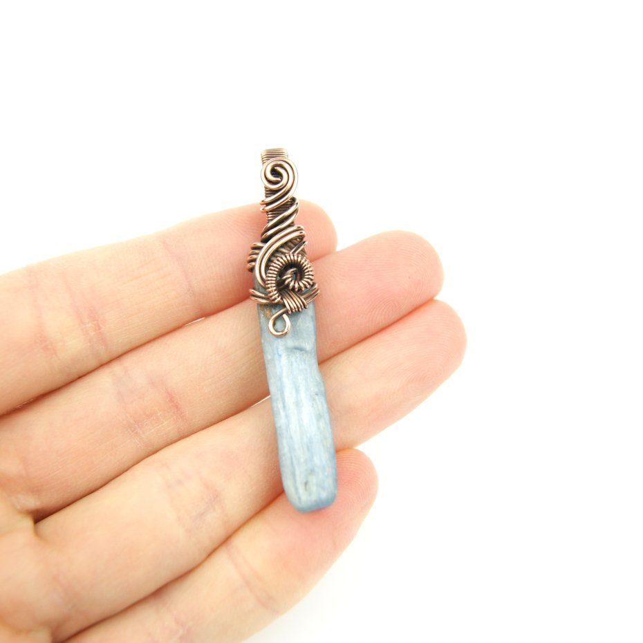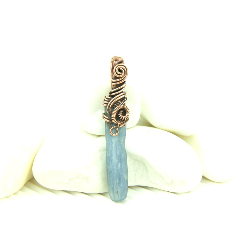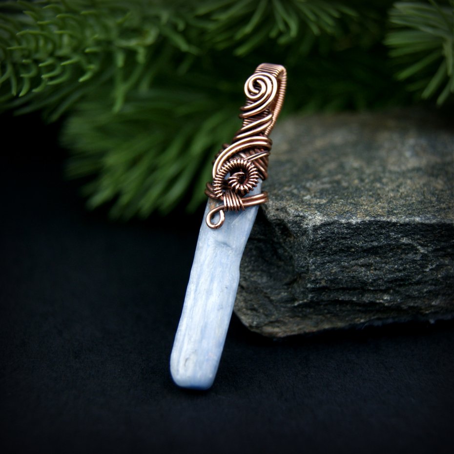 Wisiorek powstał z kyanitu o nieregularnym kształcie. Całość misternie opleciona miedzią.