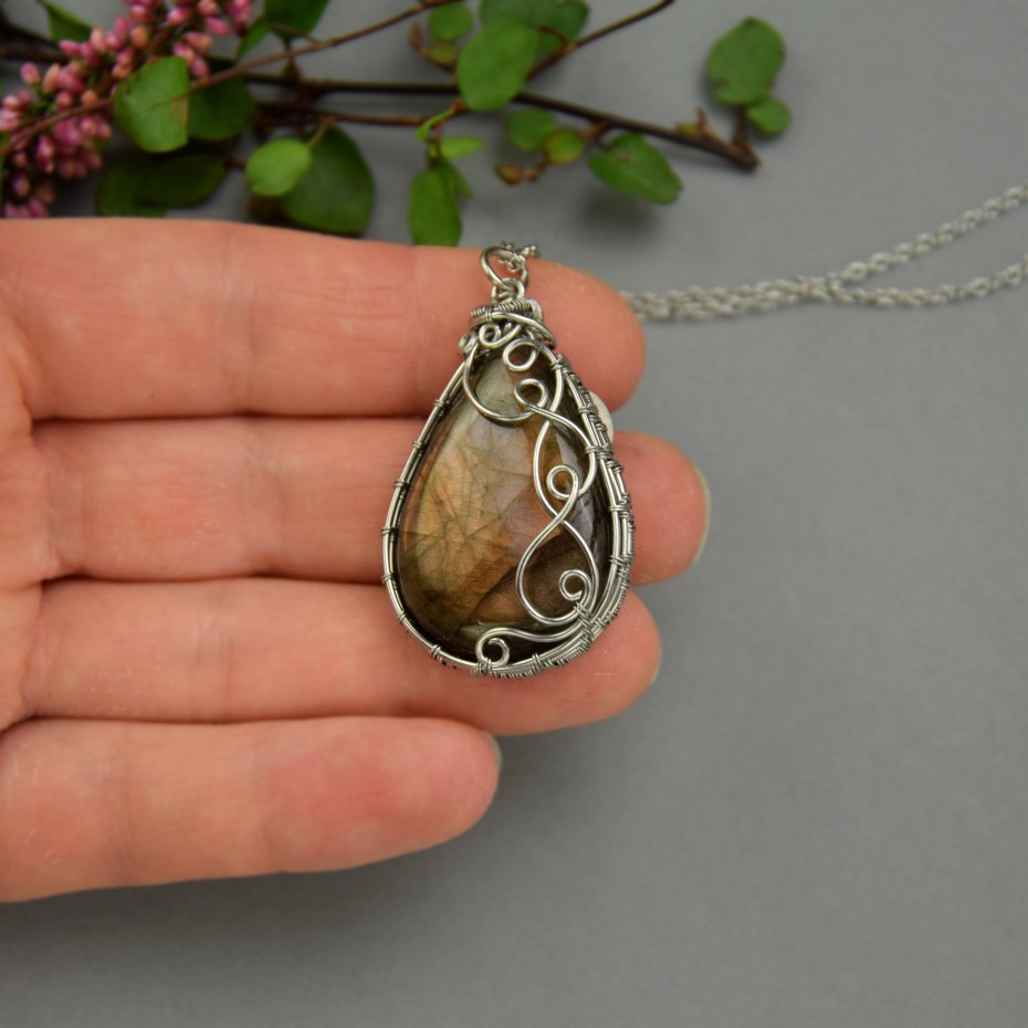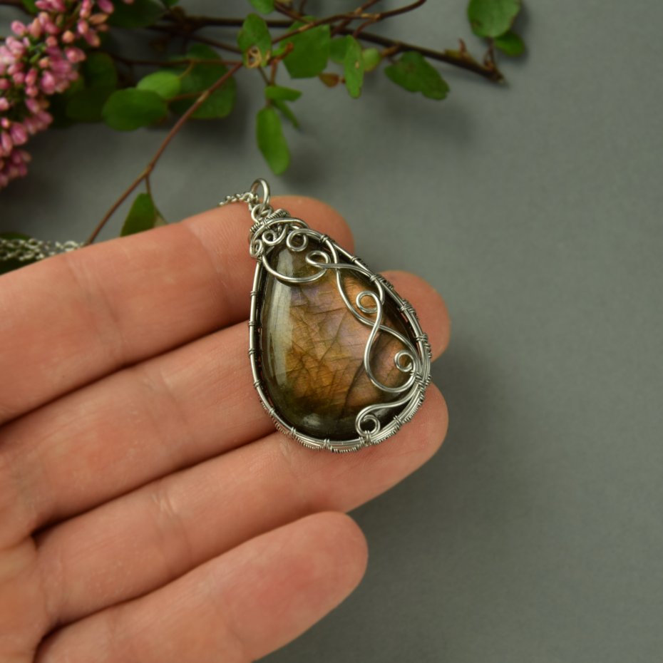 Wisiorek z pięknym labradorytem. Wykonany ręcznie techniką wire wrapping z drutów ze stali chirurgicznej. Labradoryt połyskuje na brązowo, ale w niektórych odcieniach światła wpada lekko w fiolet.