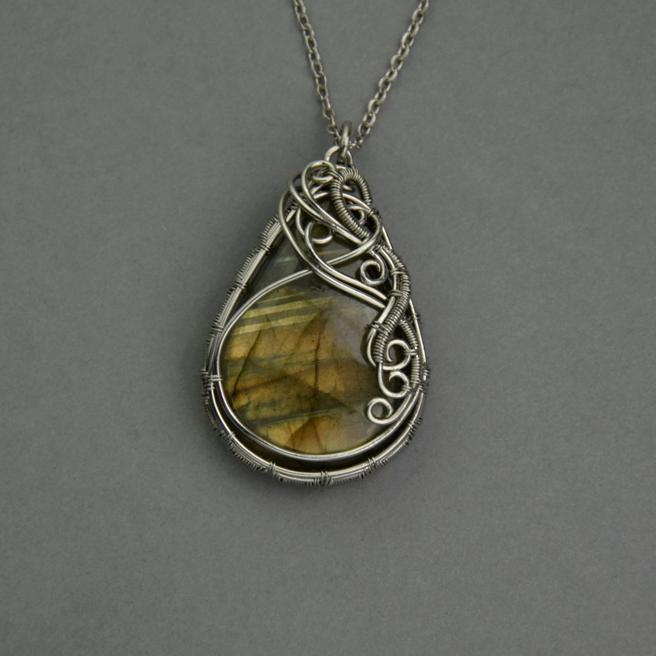 Wisiorek z pięknym labradorytem. Wykonany ręcznie techniką wire wrapping z drutów ze stali chirurgicznej.