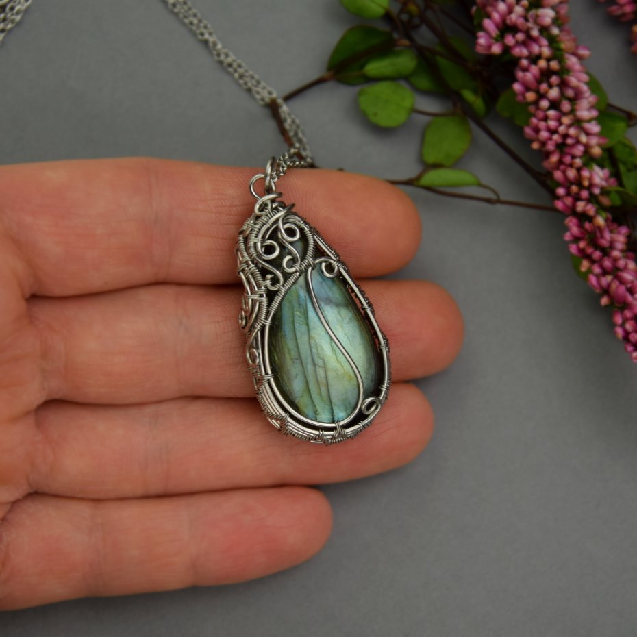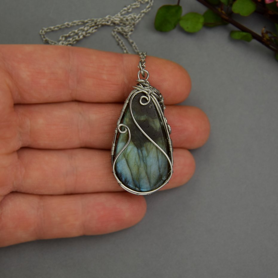 Wisiorek z pięknym labradorytem. Wykonany ręcznie techniką wire wrapping z drutów ze stali chirurgicznej.