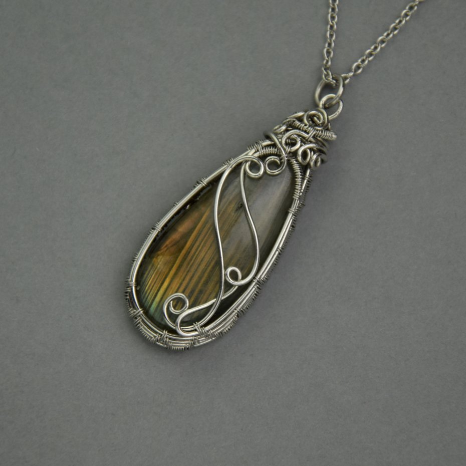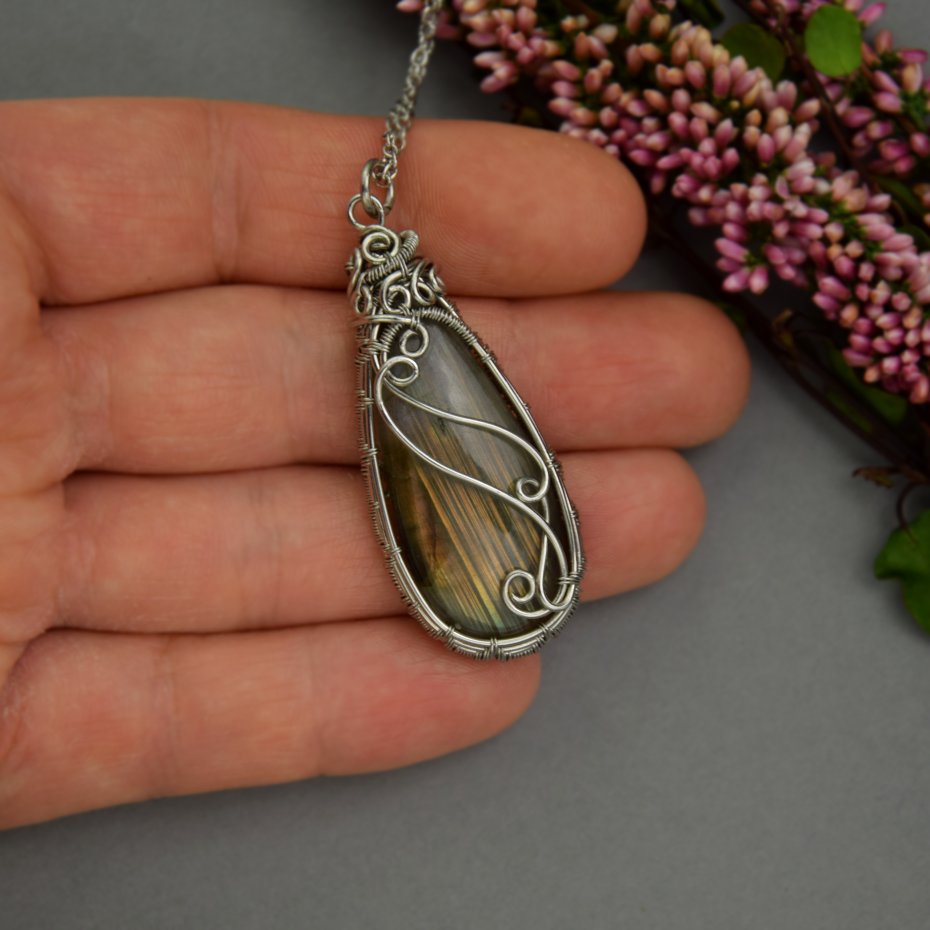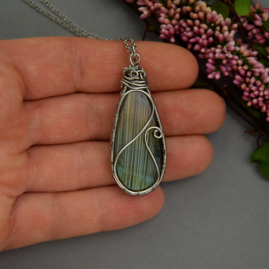 Wisiorek z unikatowym labradorytem, wykonany ręcznie techniką wire wrapping z drutów ze stali chirurgicznej.