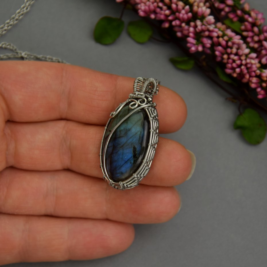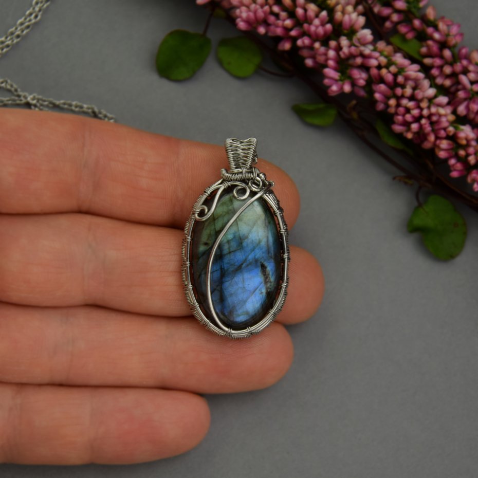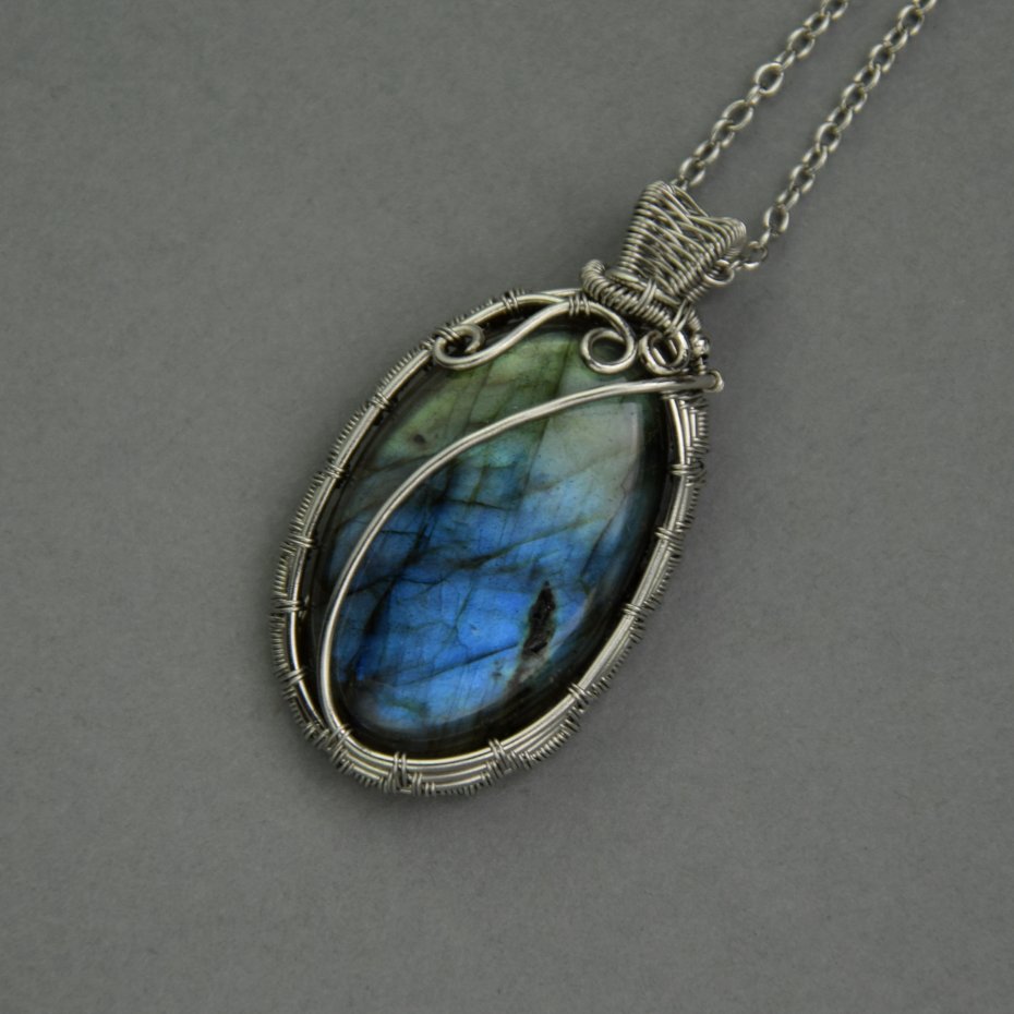 Wisiorek z unikatowym labradorytem, wykonany ręcznie techniką wire wrapping z drutów ze stali chirurgicznej.