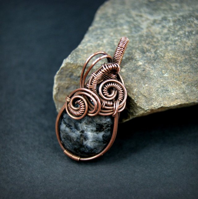 Wisiorek wykonano w pracochłonnej technice wire wrapping. Do stworzenia wisiorka użyto larvikitu, całość opleciono oksydowanym drutem miedzianym. Całkowita długość wisiorka to 4 cm. Wisiorek zawieszony jest na rzemyku o standardowej długości ok. 45 - 50 cm.