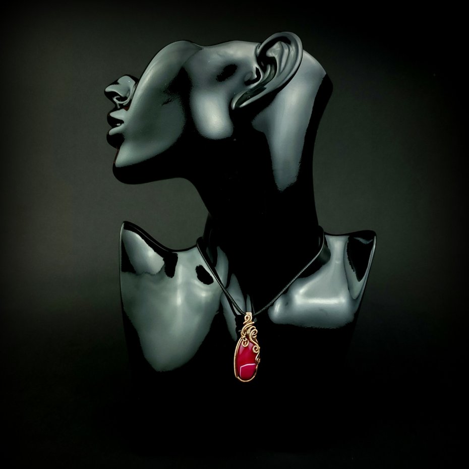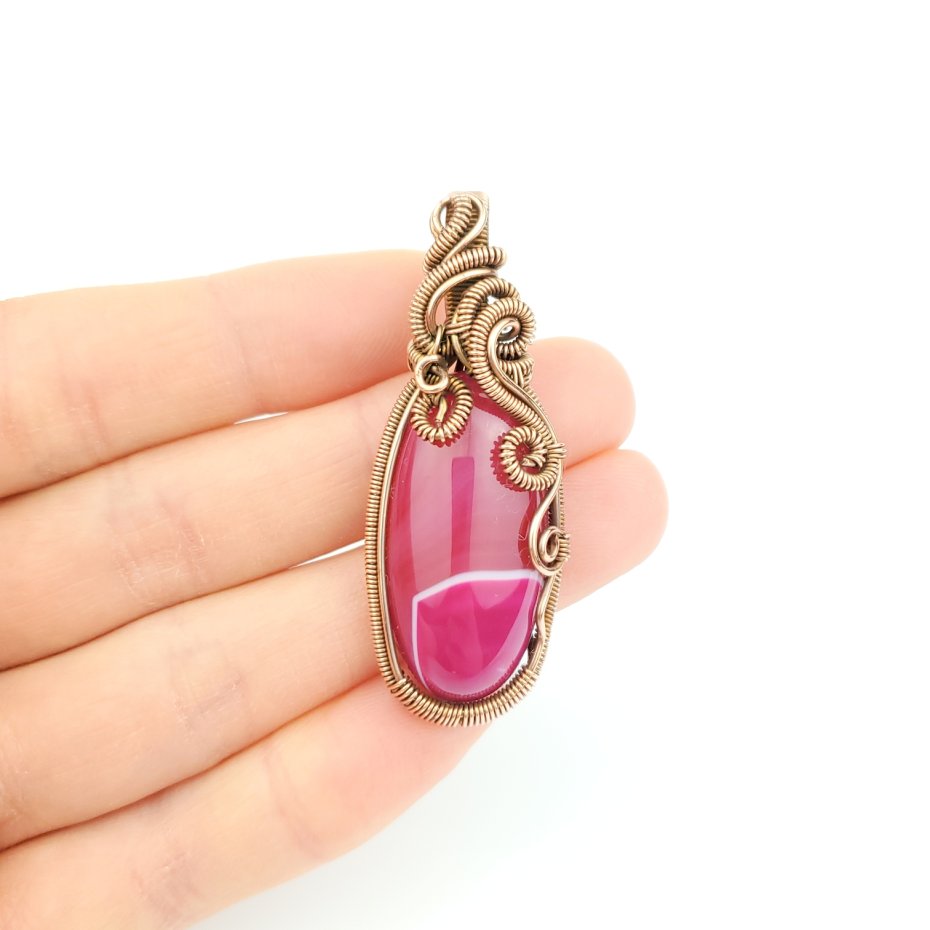 Wisiorek powstał z agatu o różowej barwie. Całość misternie opleciono miedzią. Biżuteria oksydowana.