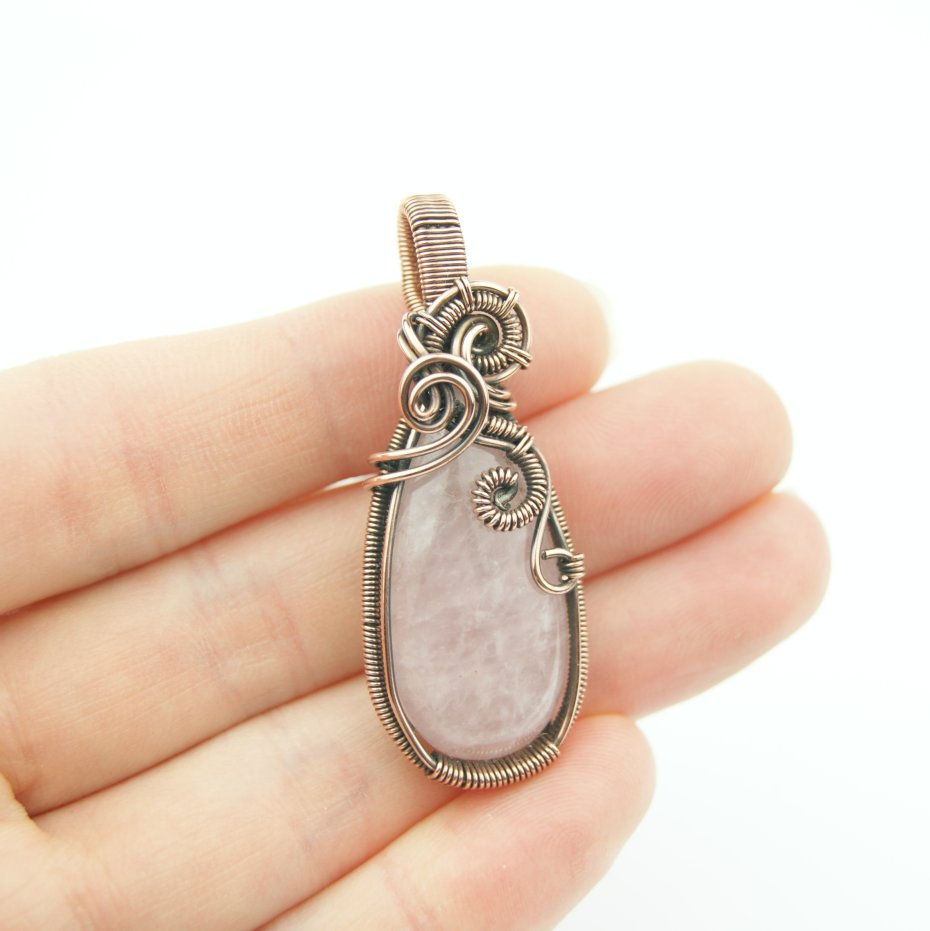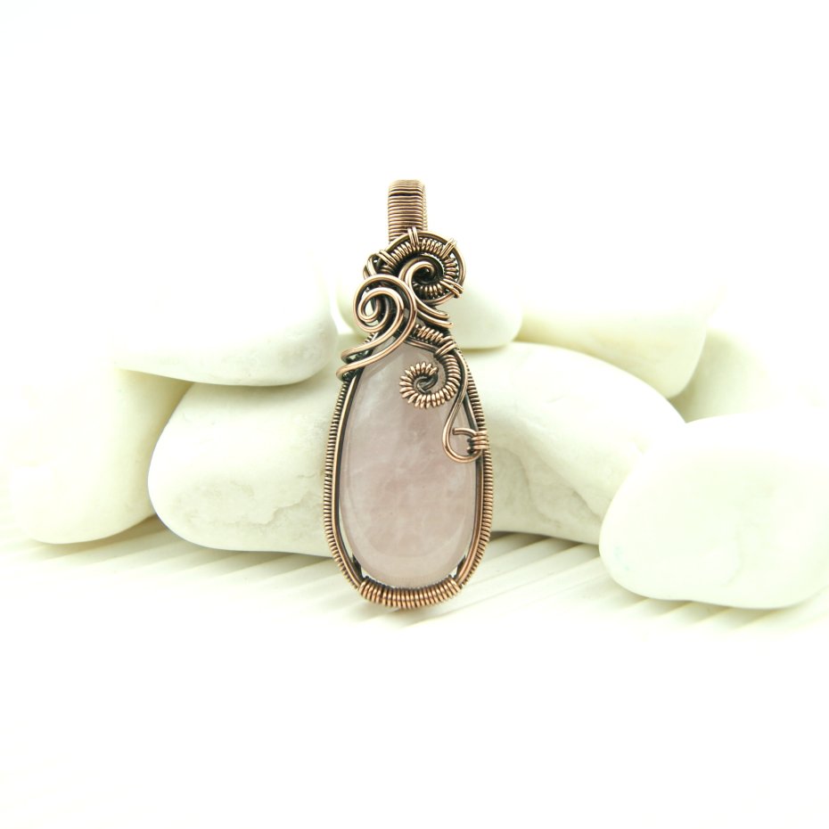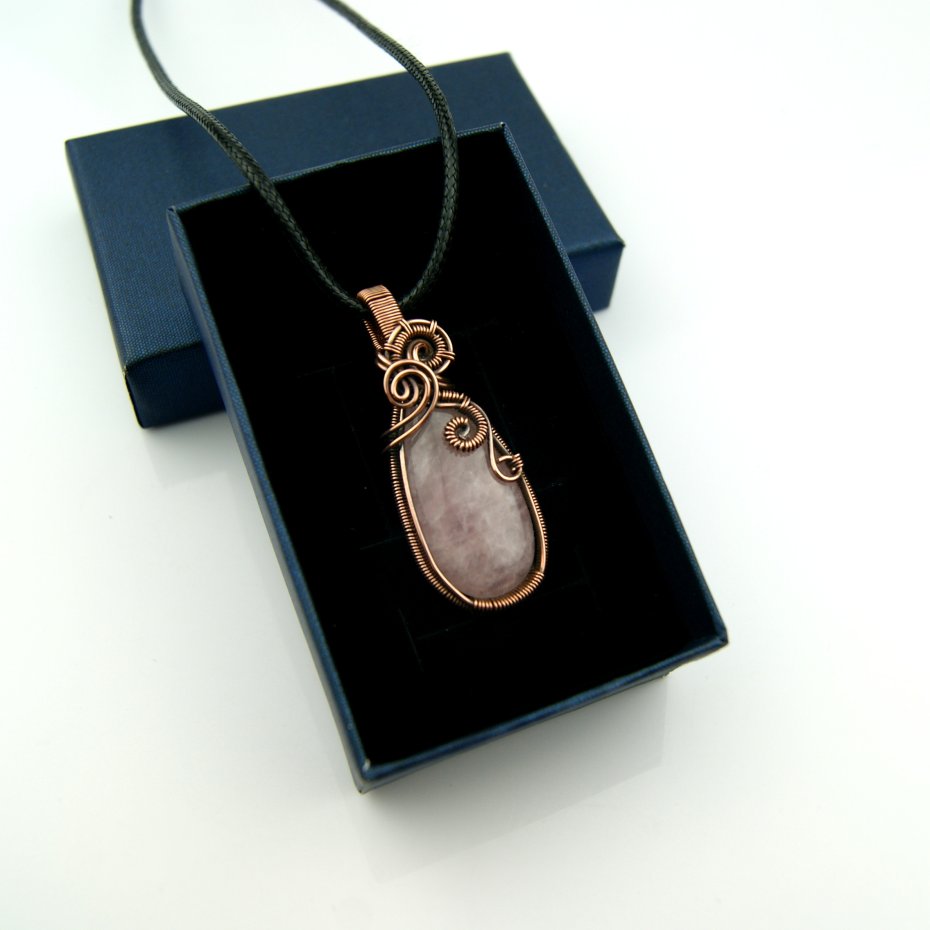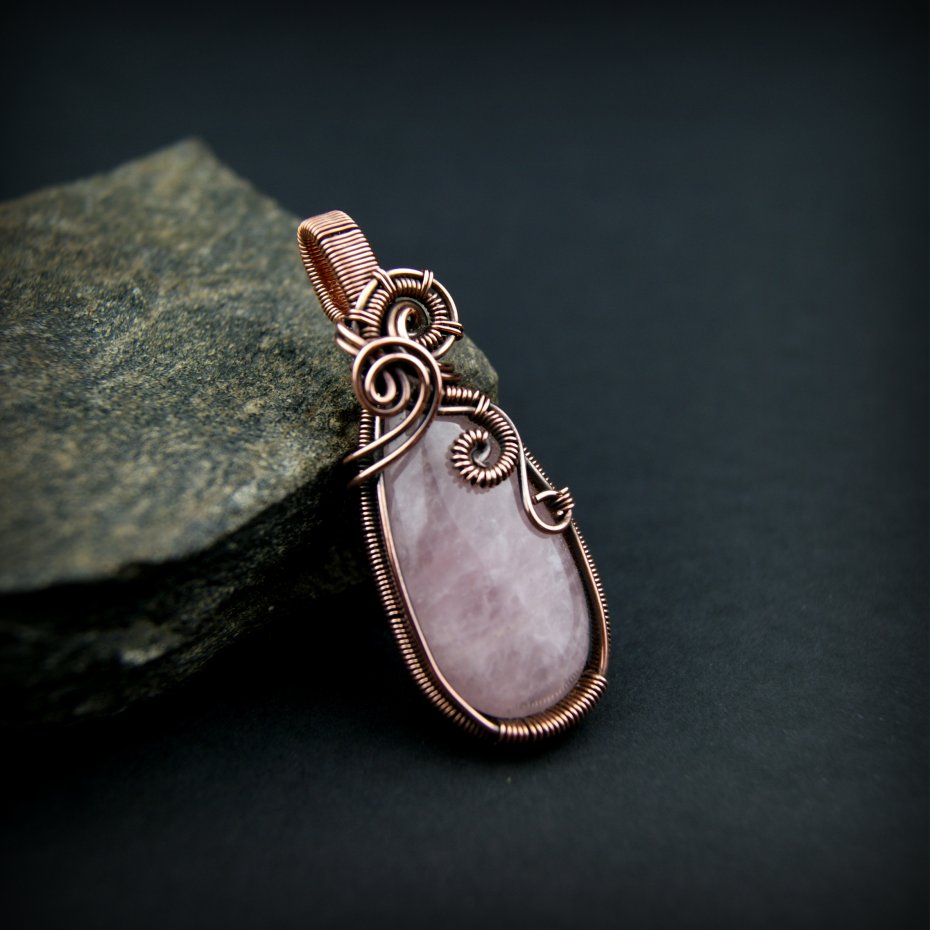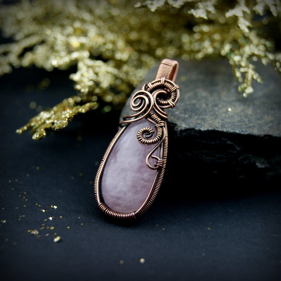 Wisiorek powstał z kamienia różowego kwarcu o pięknym bladoróżowym odcieniu. Całość misternie opleciono miedzią.