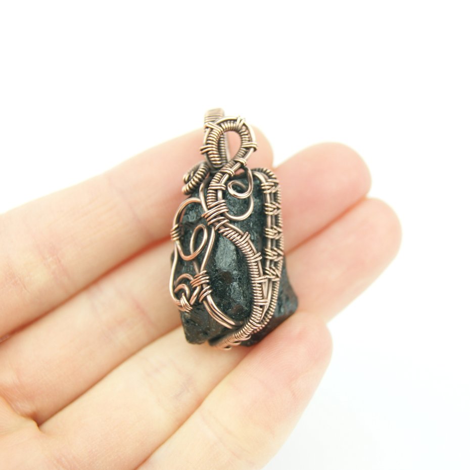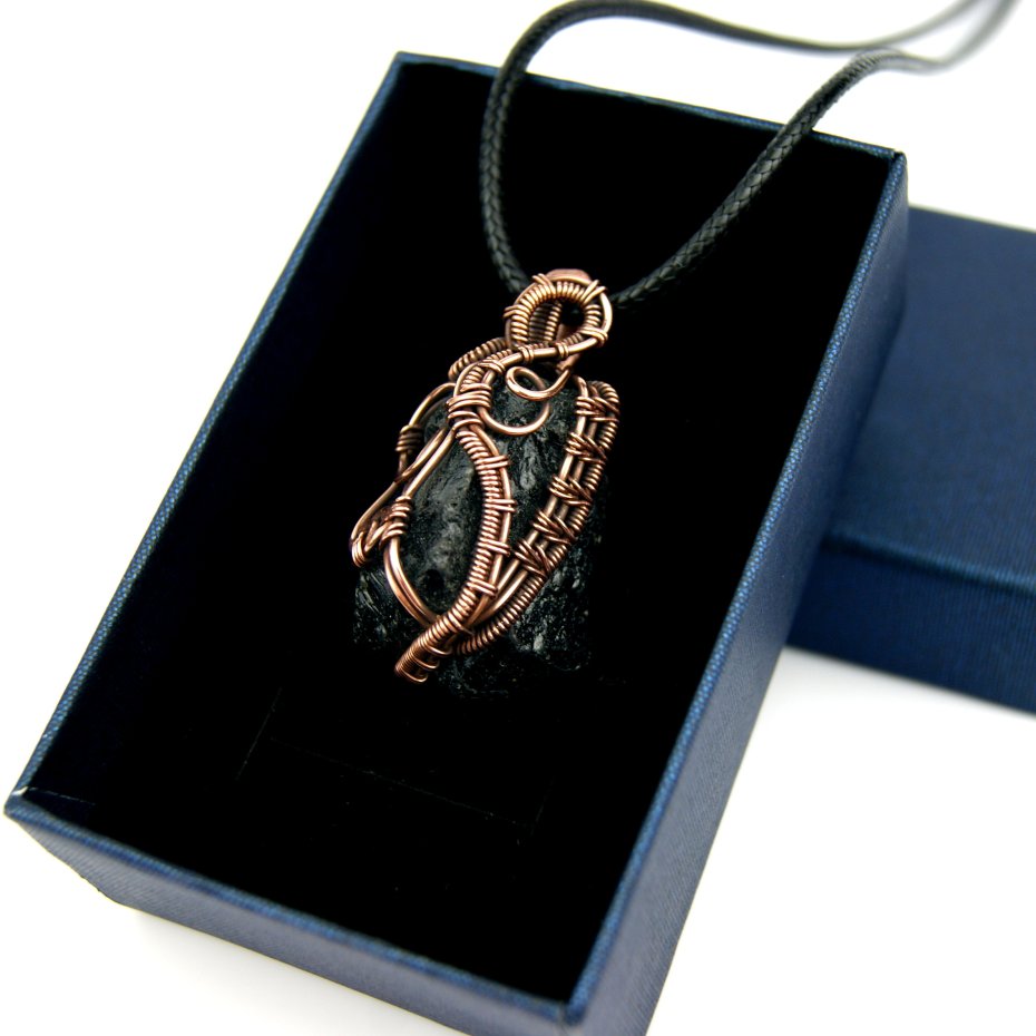 Wisiorek powstał z naturalnego turmalinu o nieregularnym kształcie, całość fantazyjnie opleciona miedzią.