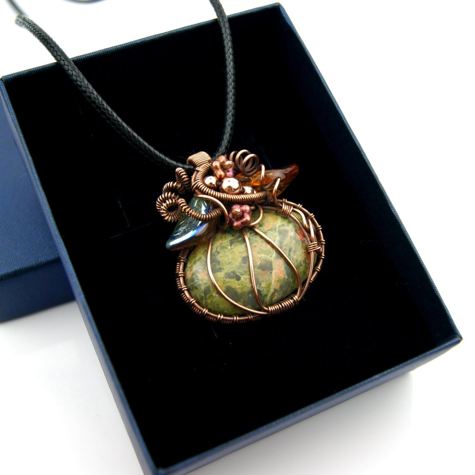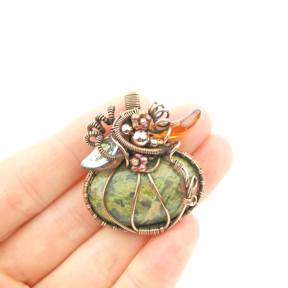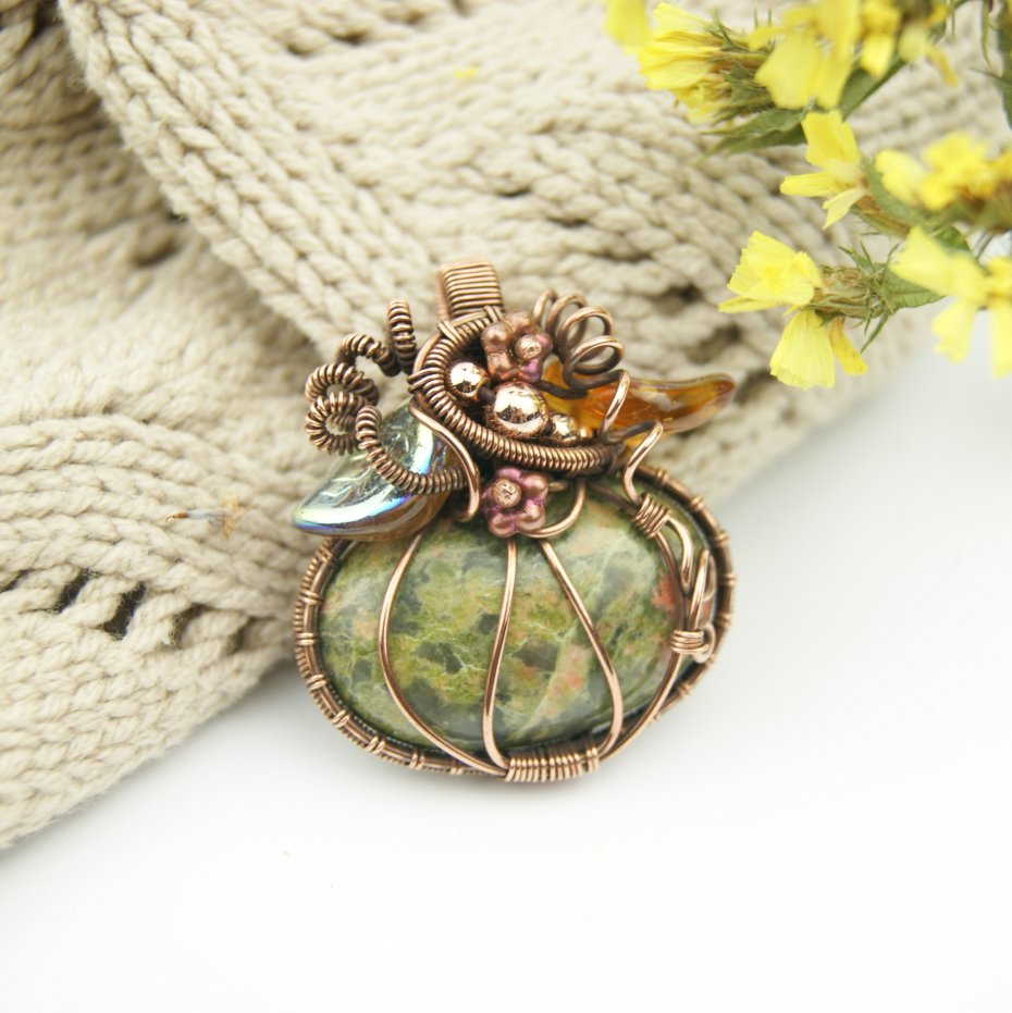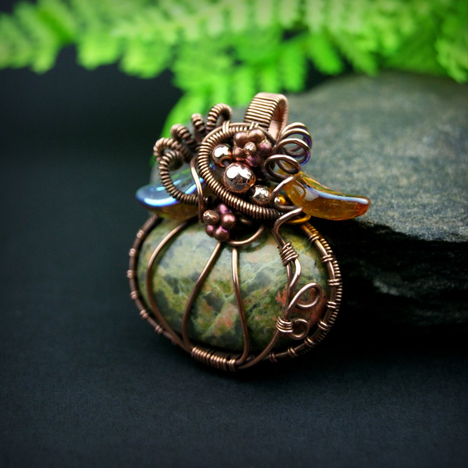 Wisiorek ma formę nawiązującą do jesiennej dyni, powstał z kamienia (unakitu) w kolorze zieleni i pomarańczu. Całość opleciono misternie miedzią, w której połyskują złote hematyty i szklane, opalizujące listki.