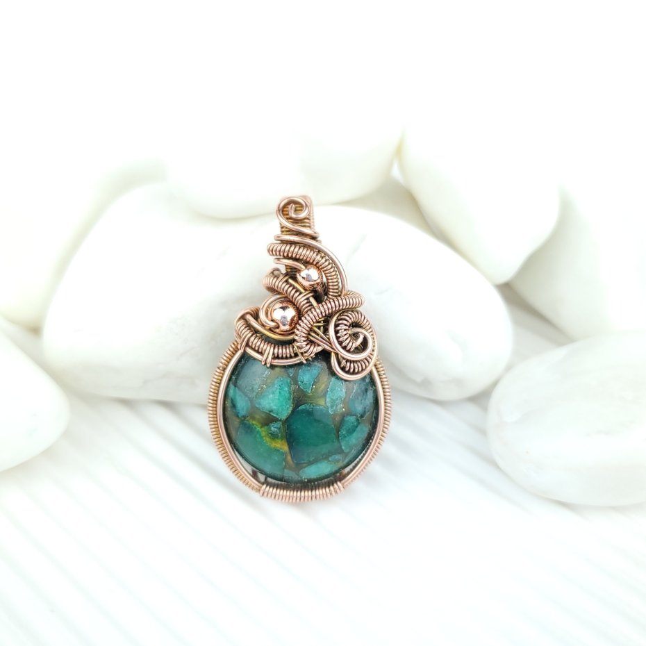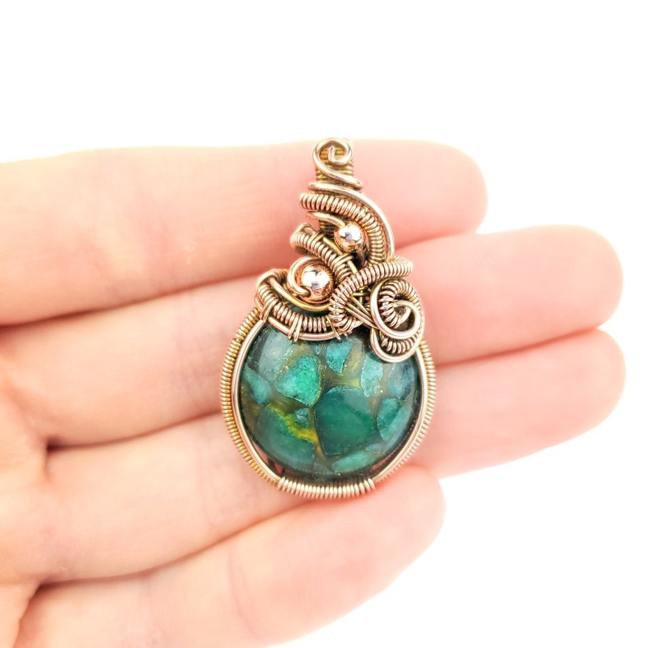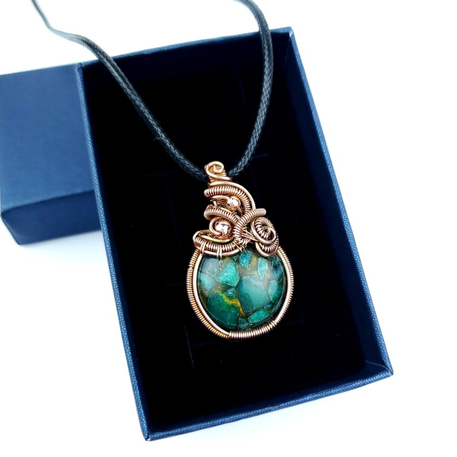 Wisiorek powstał z agatu rekonstruowanego (fragmenty kamienia połączone żywicą) o zielonej barwie. W górnej części wpleciony złoty hematyt. Całość misternie opleciono miedzią. Biżuteria oksydowana.