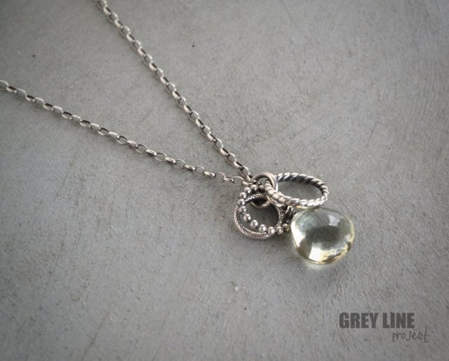 Wisiorek wykonany ze srebra próby 925, oksydowanego i przecieranego oraz dużej gładkiej kropli zielonego ametystu.