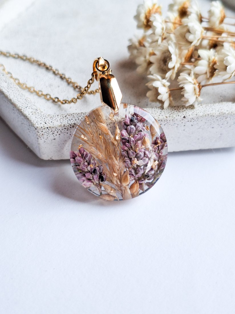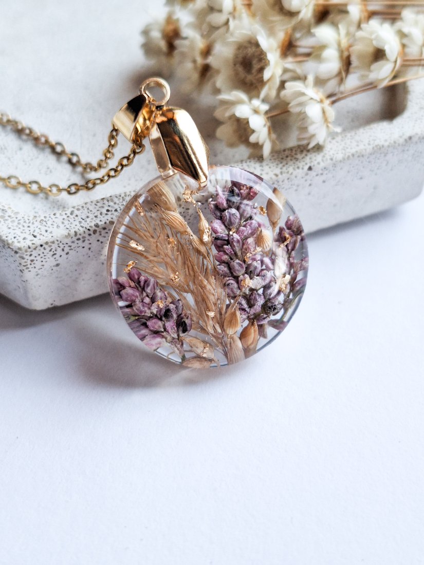 Uroczy wisiorek z zatopionymi kwiatami polnymi i płatkami złota. Wykonany z wysokiej klasy żywicy, która nie zmienia koloru pod wpływem promieniowania uv oraz wysokiej jakości stali chirurgicznej.